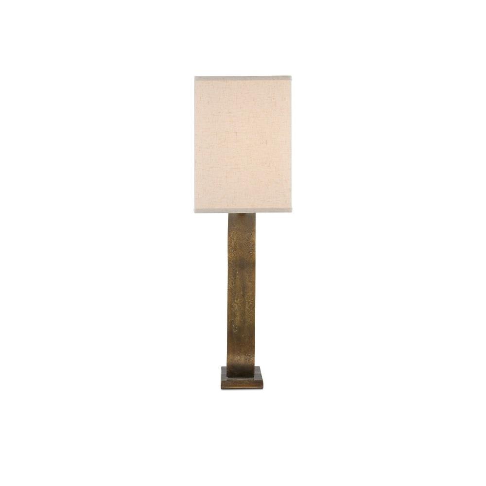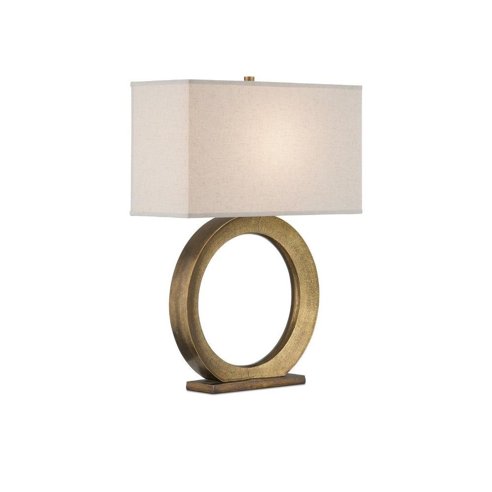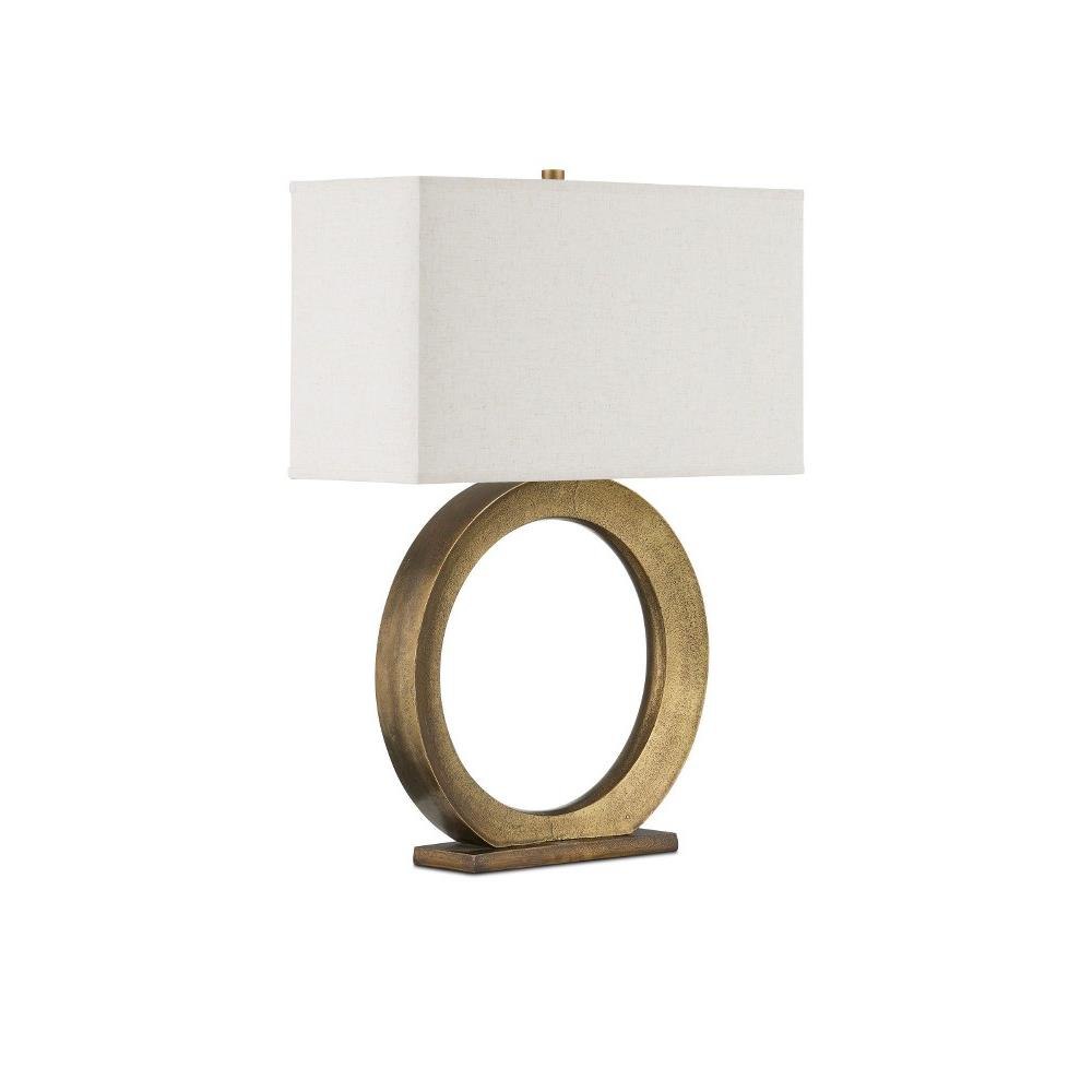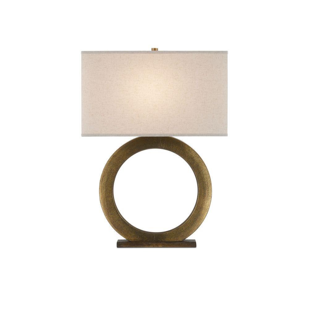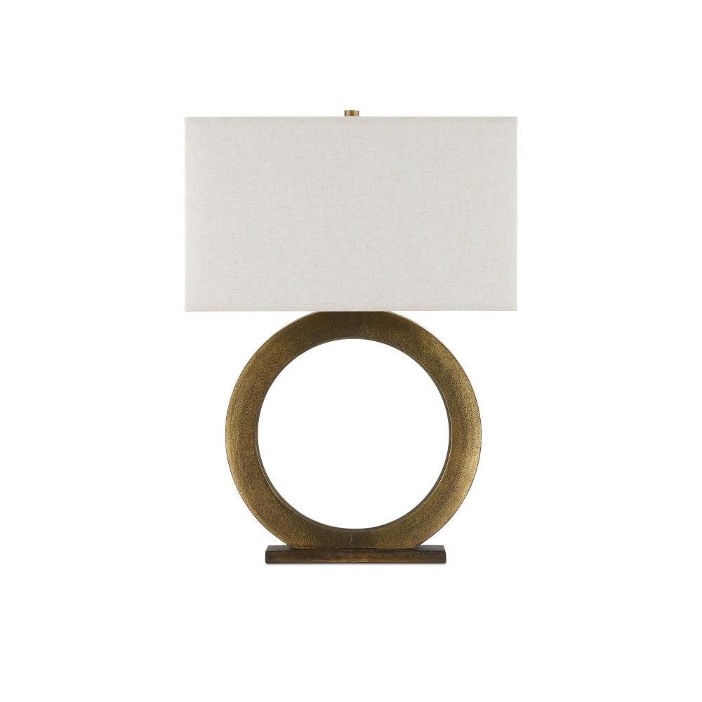The Cercle Table Lamp is a shapely deep gold lamp that reflects the playful shape behind its French name. Made of cast aluminum, the elegant ring is affixed to a minimal rectangular base in the same dark brass antique finish. The clean-lined rectangular shade, which is perfectly in scale with the body, has a sophisticated trim on the top and bottom edges.