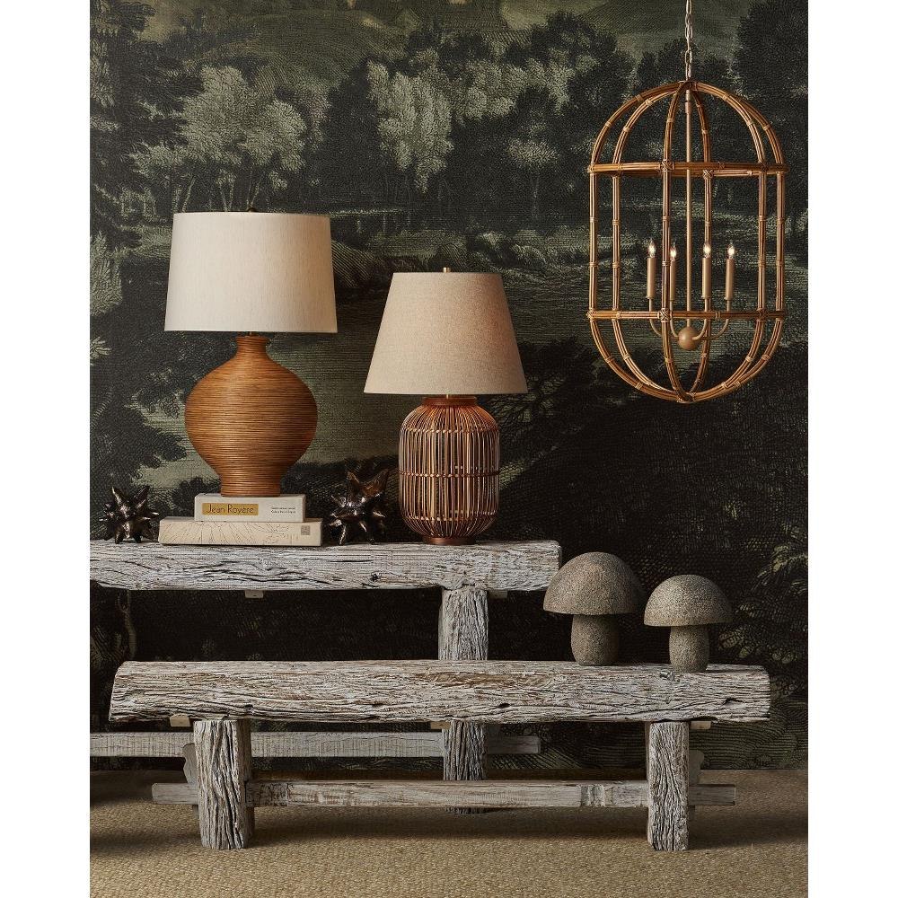 The Susel Table Lamp is handmade through a painstaking process whereby artisans take strips of rattan without the skin and wrap it seamlessly around the contemporized ginger-jar shape. Achieving such a uniform linear feel is a true feat. Complementing the warmth of the natural material is the nubby shade, and the hardware and finial in an antique brass finish.