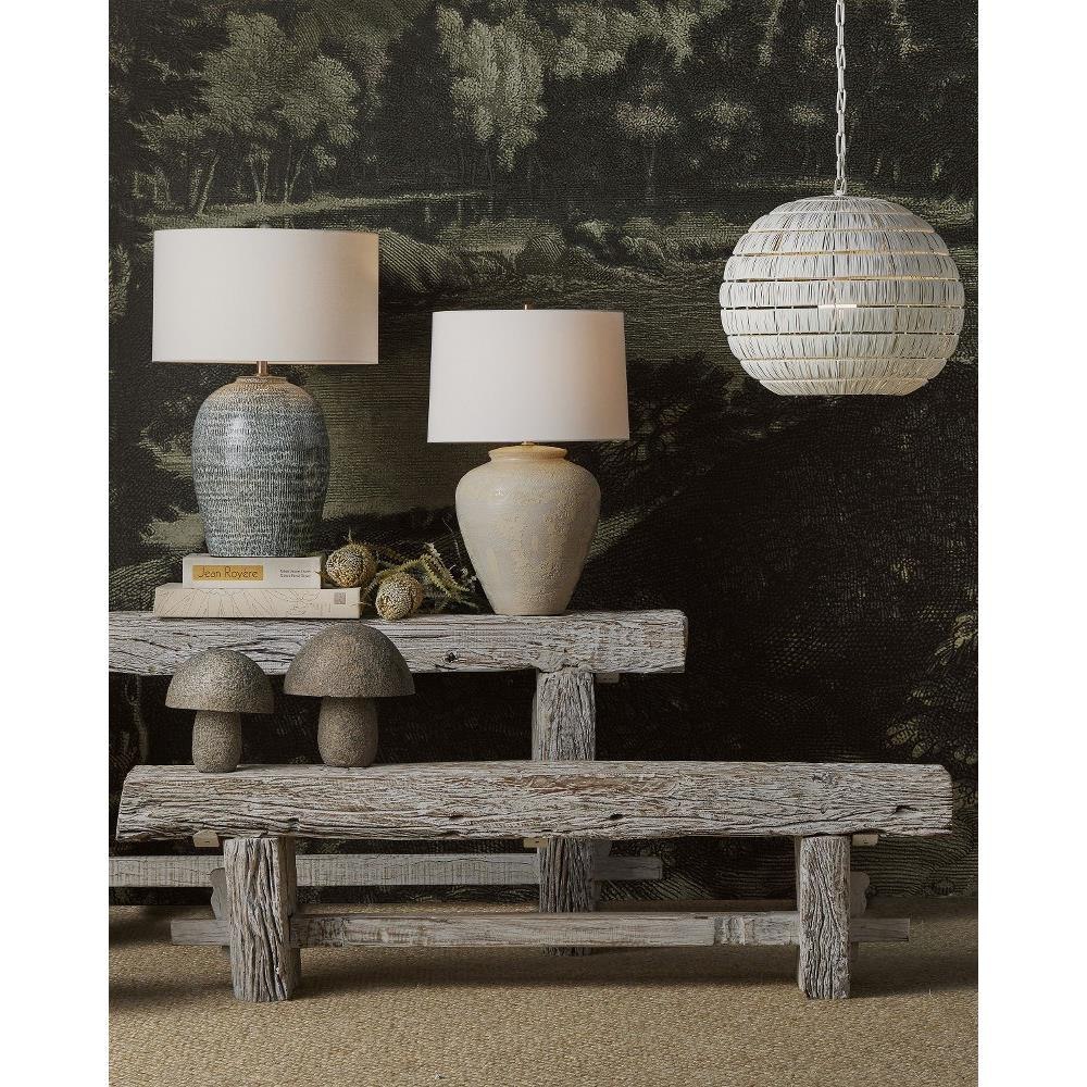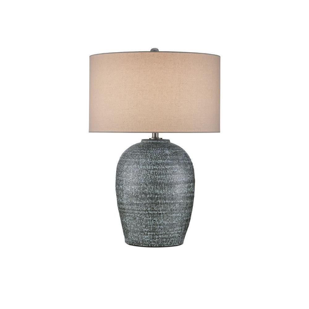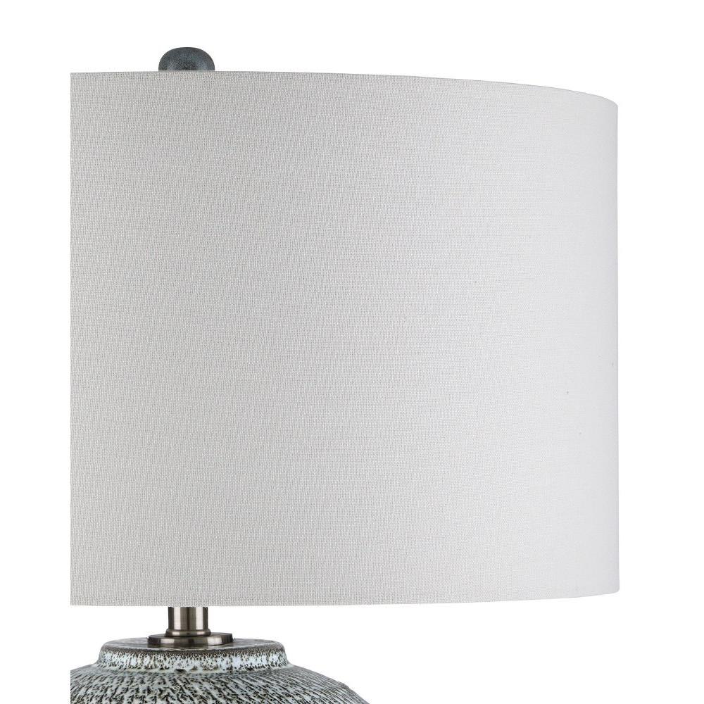 The Agatha Table Lamp is made of ceramic covered in a pattern that intermingles reactive black and white glazes, so the lamp could read as grayish or bluish in color depending upon the natural light in a space. The textural quality the striations bring the lamp’s body add a dynamic patina to a room.