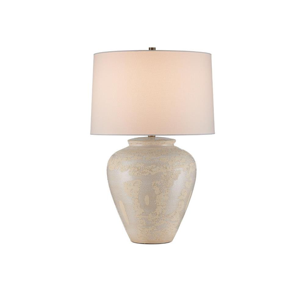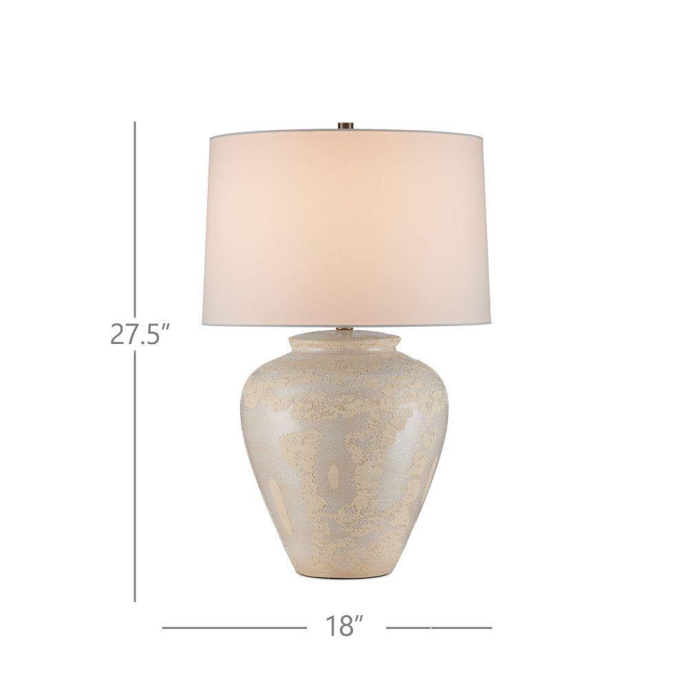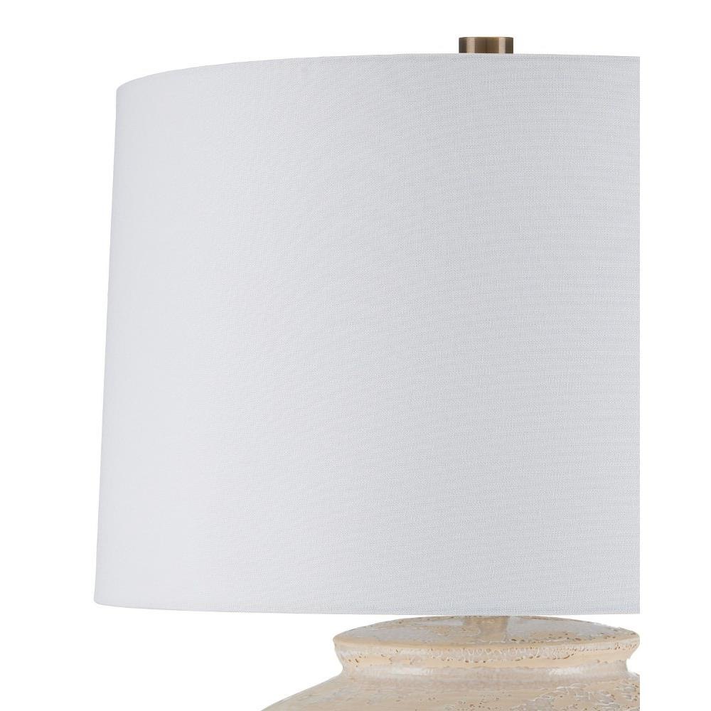The Mimi Ivory Table Lamp is made of ceramic with a mix of ivory and cream glazing, which creates a swirling pattern to give its surface tone-on-tone depth. The ginger-jar shape of the cream-colored lamp is topped with an drum shade that echoes the pale hues in its body. The artisanal quality comes into full view when the surface of the lamp is viewed close up.