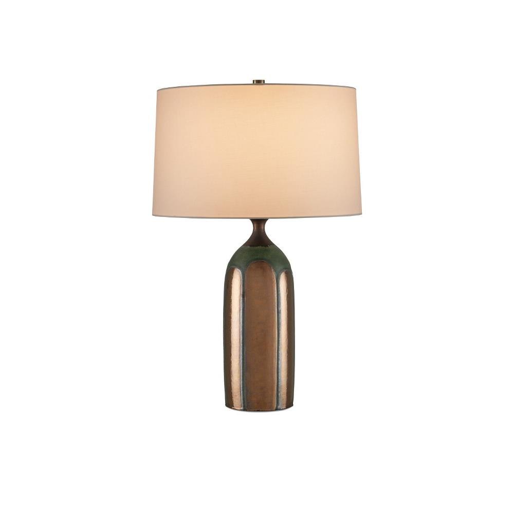 Dripping with artistic appeal, the Cuprum Table Lamp earns its name from the copper glaze that enlivens its bottle-shaped surface. Trickling down from the point where the ceramic lamp’s body begins to swell, a dark green glaze flows toward the bottom where it ends in runnels that expand in a painterly fashion.