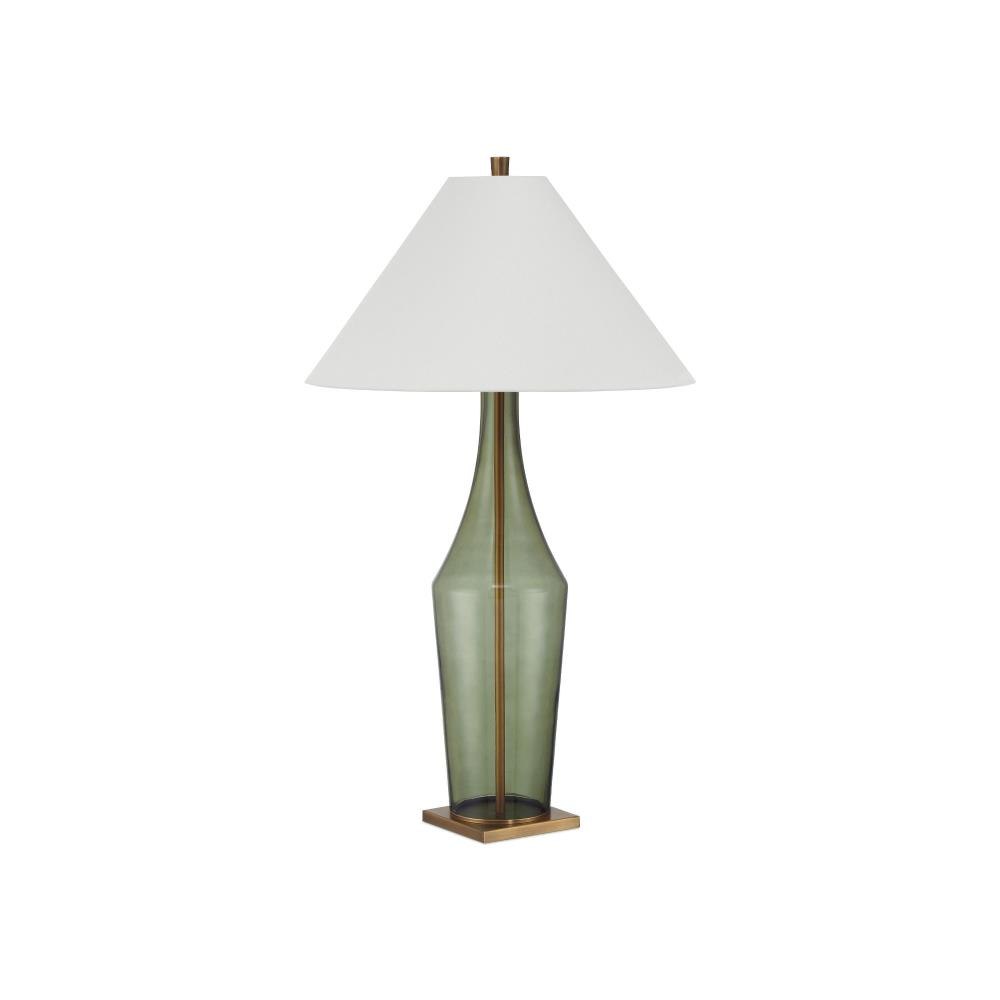The Olive Green Table Lamp features a tall, bottle-shaped body crafted from transparent glass in a rich green hue that radiates warmth. The slender profile is grounded by a square metal base in an antique brass finish with a coordinating ring that cradles the glass form. Standing at 33.5 inches tall, the lamp is topped with a pale empire shade.