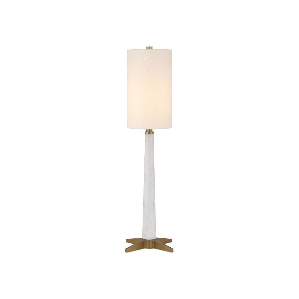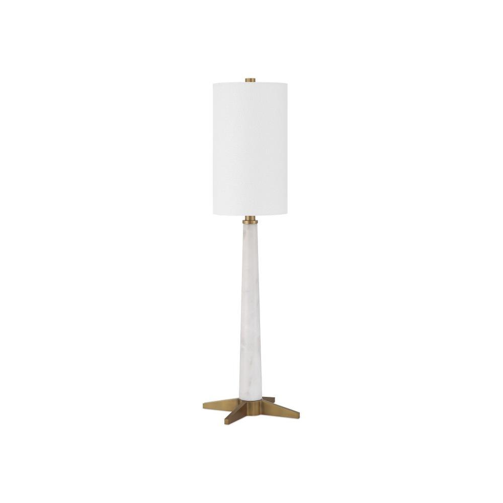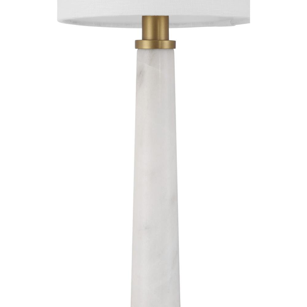 The Munroe White Table Lamp channels the streamlined elegance of 1920s and 1930s Art Deco design through a minimalist lens. Its telescoping body, crafted from white marble with subtle gray veining, rises from an X-style base in an antique brass finish. The lamp’s slender profile brings it a compact footprint, though it is fairly tall.