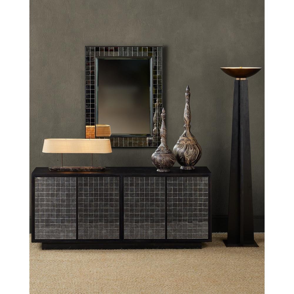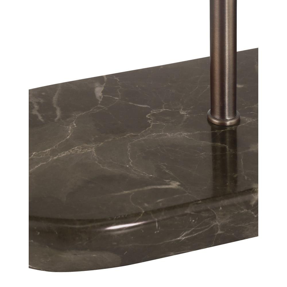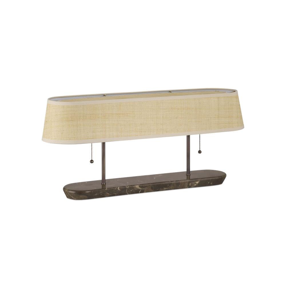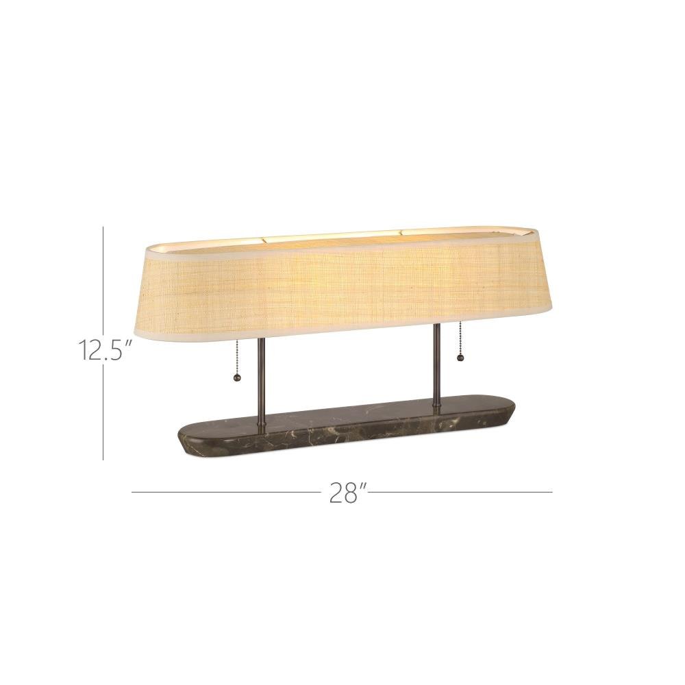 The Museum Desk Lamp captures the spirit of mid-century modern design with its sleek lines and thoughtful use of natural materials. Its elongated body—over two feet in length—is crafted from rich brown marble with soft ivory and cream veining, paired with a dark bronze metal finish that complements the stone’s depth. A woven rattan shade adds warmth and texture, echoing the era’s embrace of organic elements.