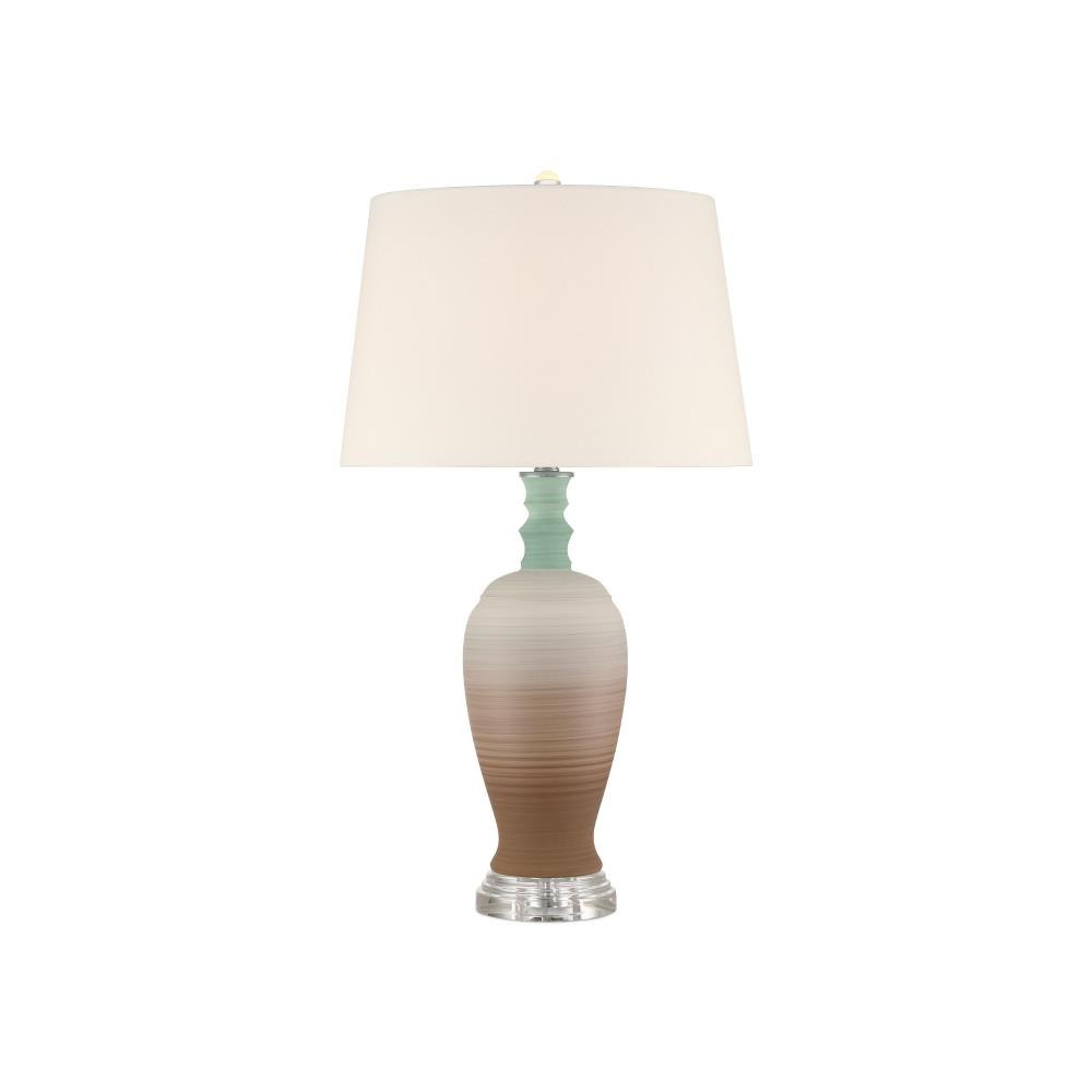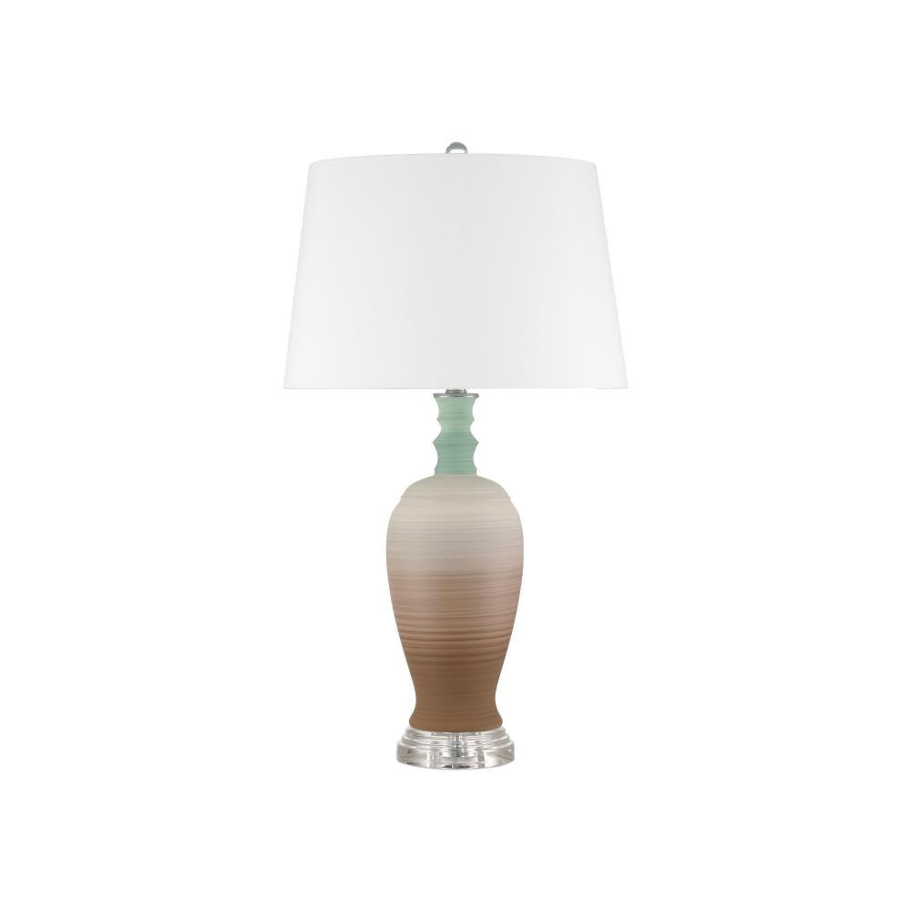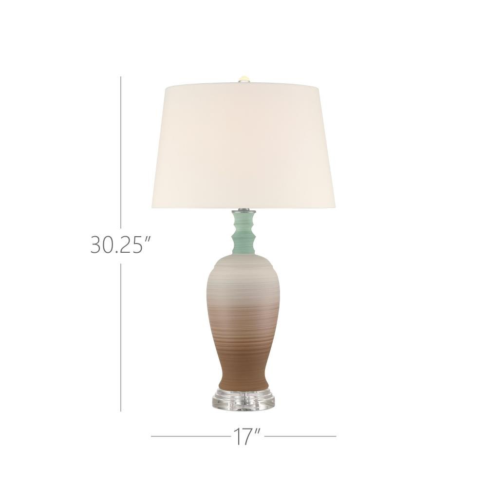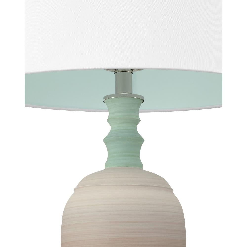 A playful retro vibe enters a room when the Happy 80's Green and Brown Vase Set come on the scene. The lamp’s body is painted with unique striations of earthy brown and pale blue that are achieved while still spinning on the potter's wheel. The result is a layered pattern that adds depth and character to the design. The shade that is fastened with an optic crystal finial is white on the outside and lined in a blue fabric.