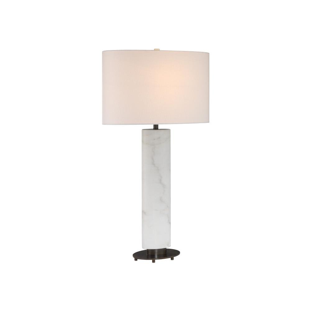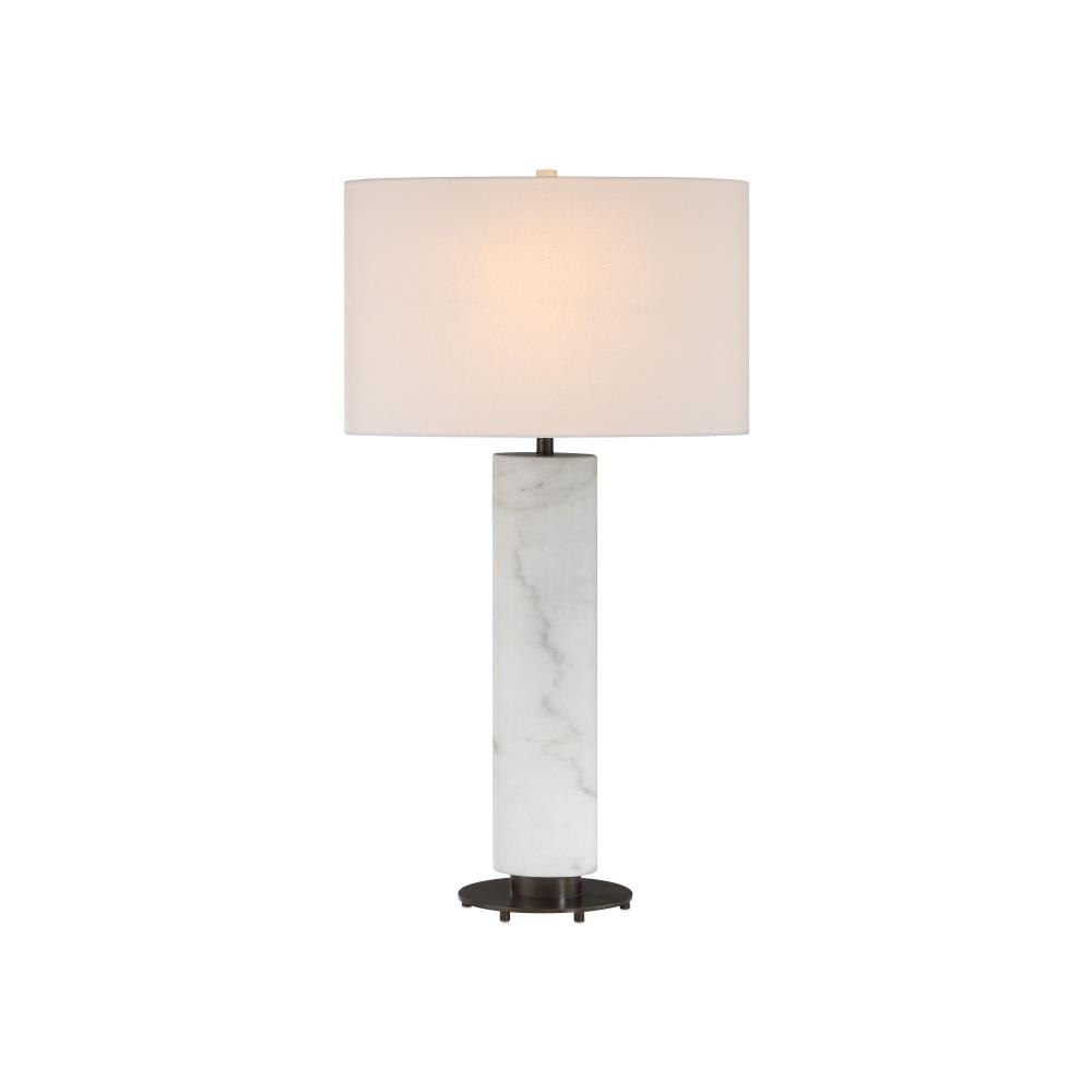 The Stanhope White Table Lamp features an elliptical body honed from white marble with natural dark gray veining, echoed in its larger oblong shade for a cohesive, sculptural look. Its architectural-inspired base adds depth and contrast—a slightly oversized black metal disc rests on discreet feet and is topped with a smaller elliptical plinth, creating a layered design that gives the lamp a subtle floating effect.