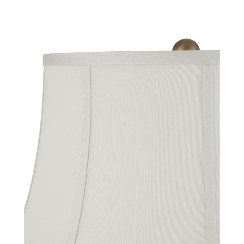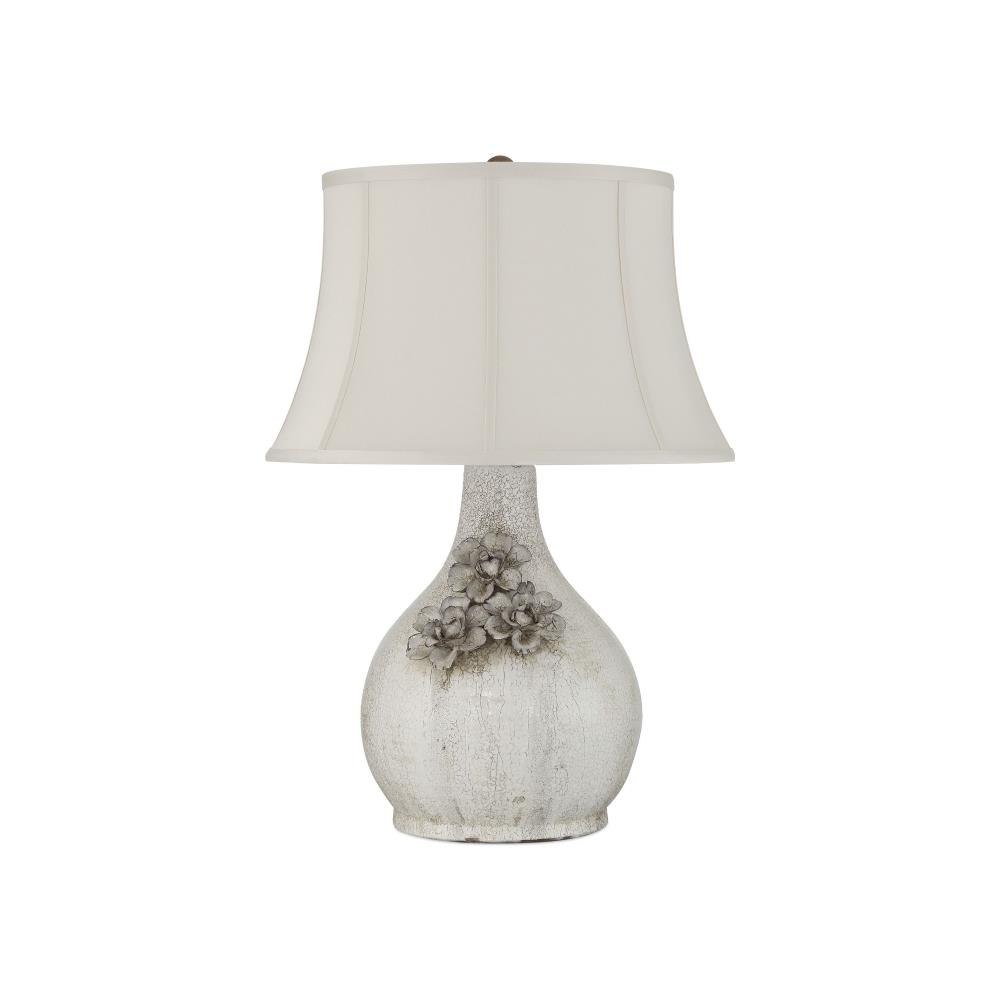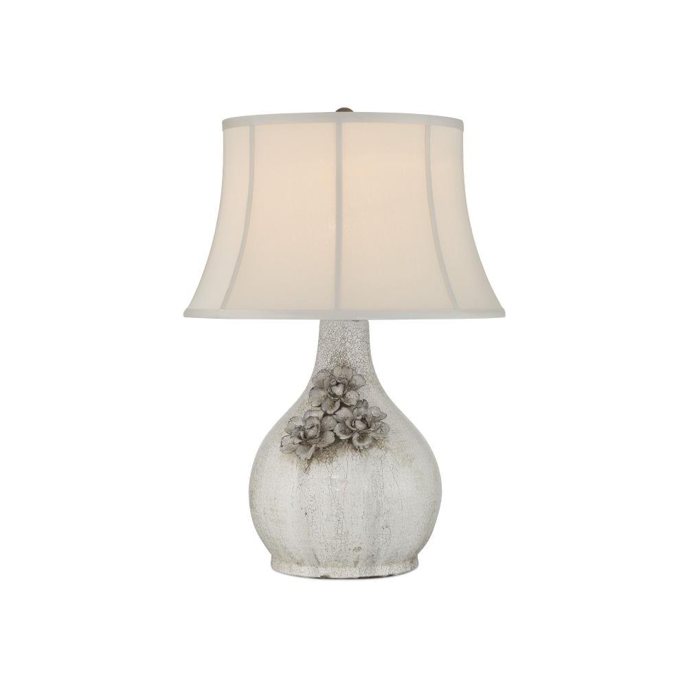 The Attar White Table Lamp is crafted from ceramic with a crackled, falling glaze that gives each piece a unique, aged character. The textured finish is especially pronounced on the trio of hand-formed flowers applied to the lamp’s body, adding dimension and artisanal detail. A soft-backed, bell-shaped shade completes the design, enhancing the vintage-inspired look with a gentle, traditional silhouette.