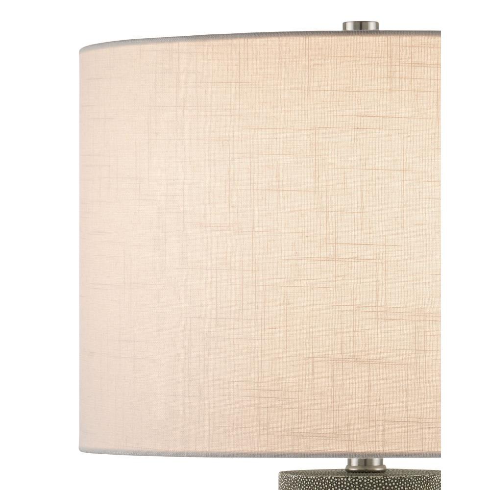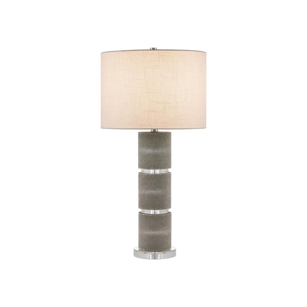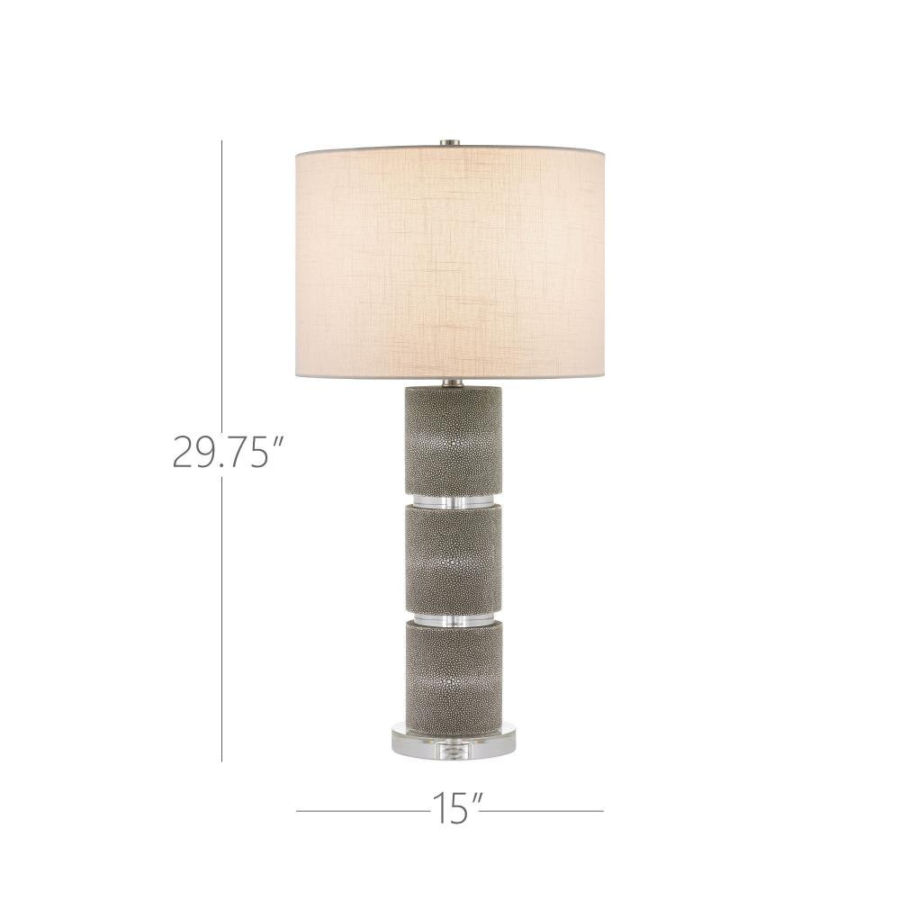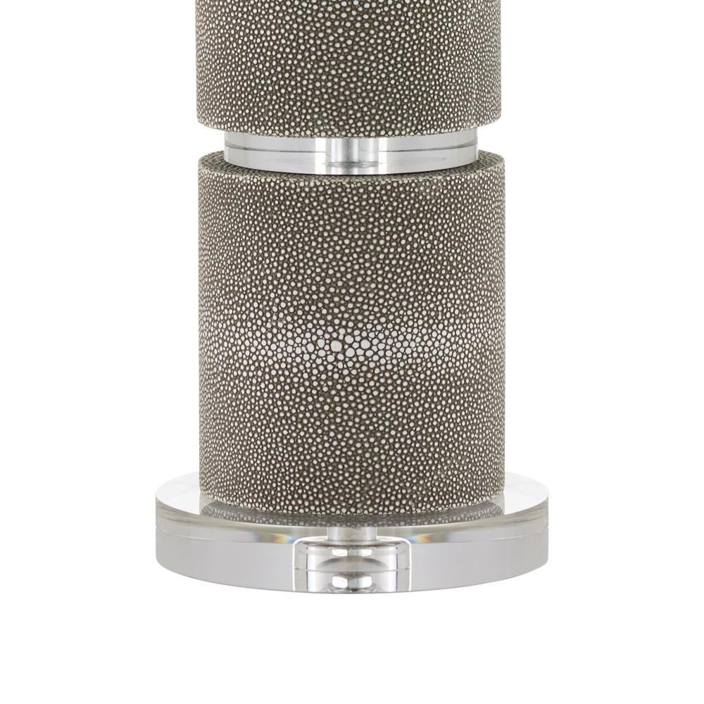 The Lofitt Table Lamp showcases a stacked cylindrical body wrapped in faux gray shagreen, with rings of optic crystal separating each segment for a refined, high-contrast look. A slightly larger optic crystal base anchors the design, its signature clarity and texture enhancing the lamp’s luxe profile. At nearly 30 inches tall, it’s a well-proportioned piece, finished with a slubby linen shade that adds a soft, woven texture through its visible weft and warp detailing.