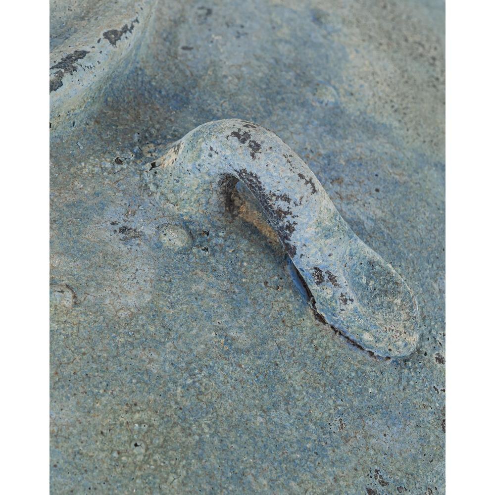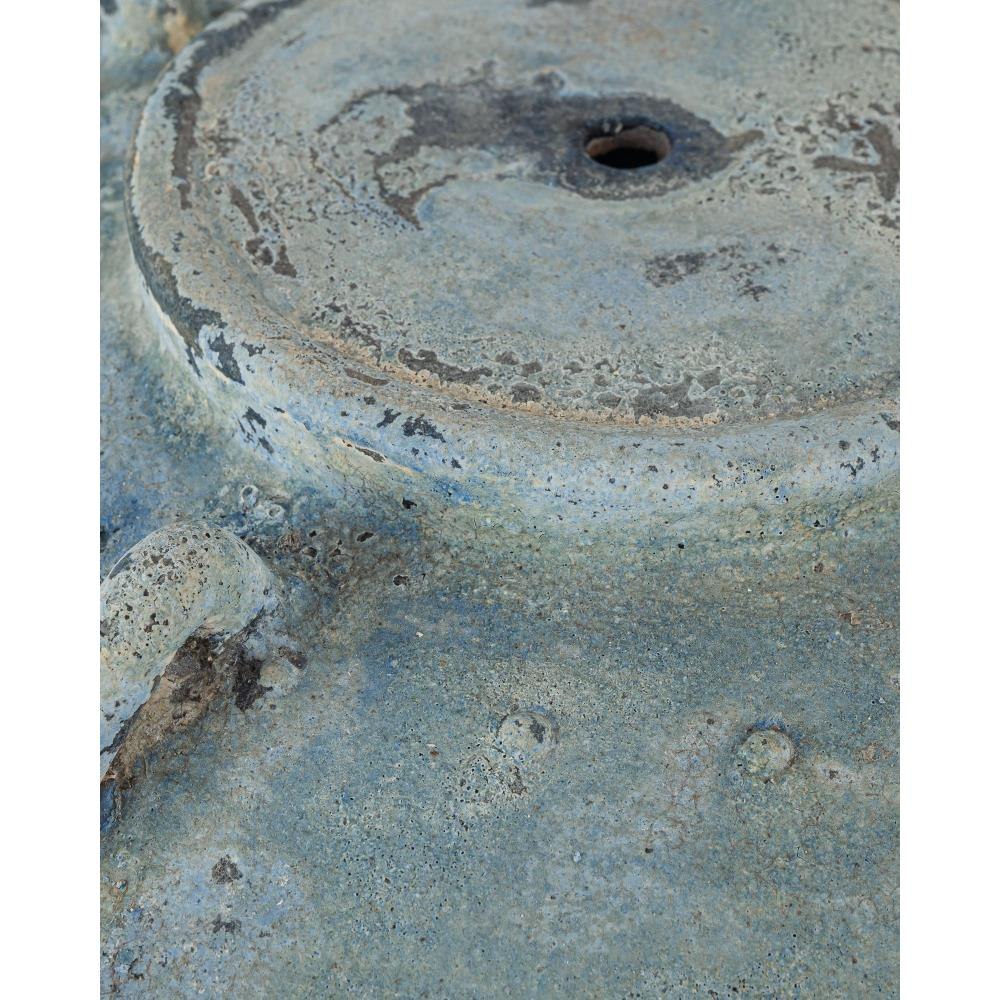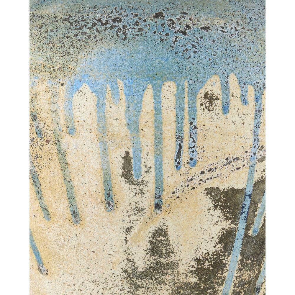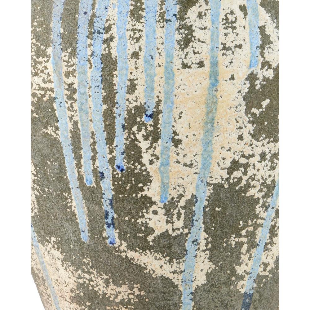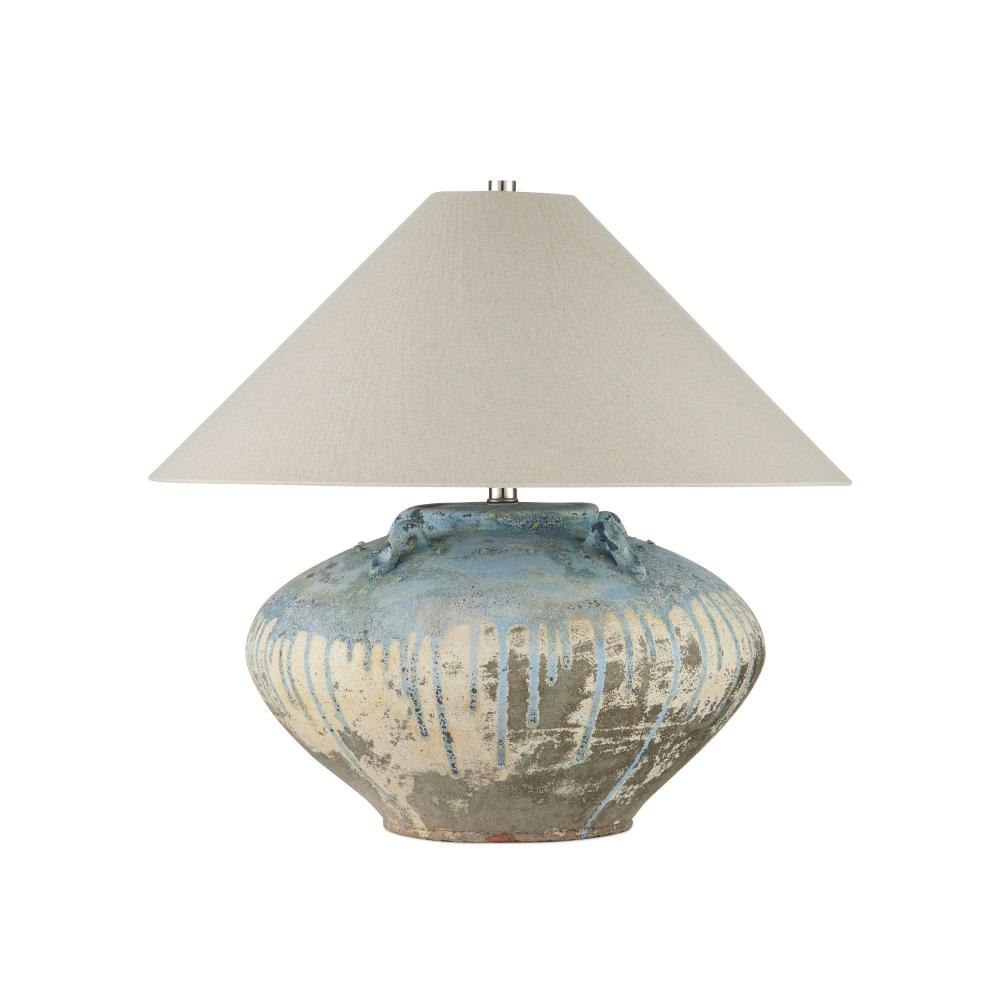 The Catania Antique Blue Drip Table Lamp is hand-built from terracotta and finished with layers of pale ivory and dripped blue glaze, applied by artisans for a richly varied, one-of-a-kind finish. The contrasting hues highlight the raw terracotta beneath, giving the piece a timeworn, Mediterranean character that feels centuries old. With its substantial jar-shaped body measuring two feet in diameter, the lamp makes a bold statement, while the flared modern empire shade adds a refined contrast to its rustic, handcrafted base.