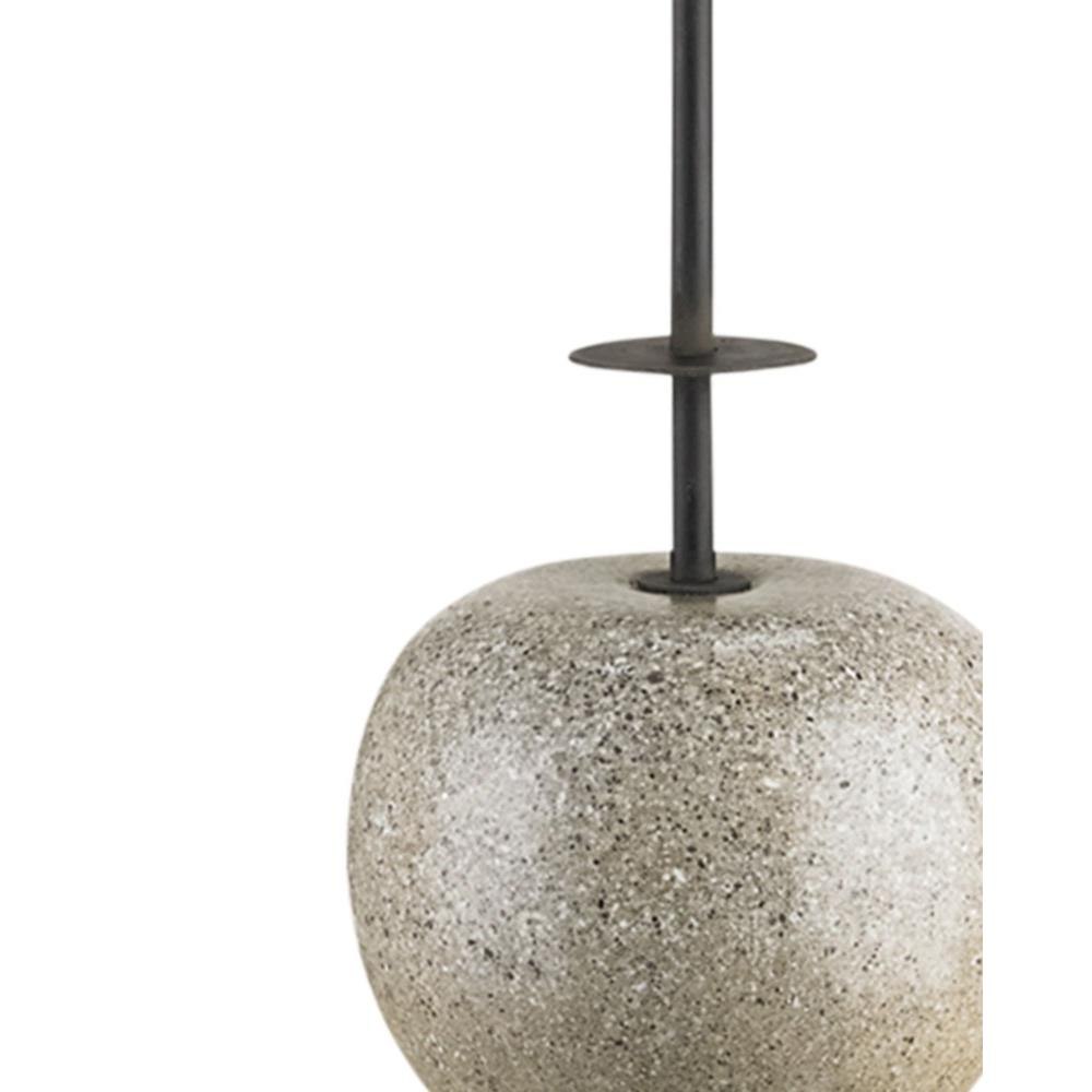 The Atlas Console Lamp is weighted by its globe-like polished concrete base. The slender body, its disc accents, and the circular finial in a blacksmith finish make this a strong design. The proportion of the off-white linen shade on this black lamp brings it a worldly charm.