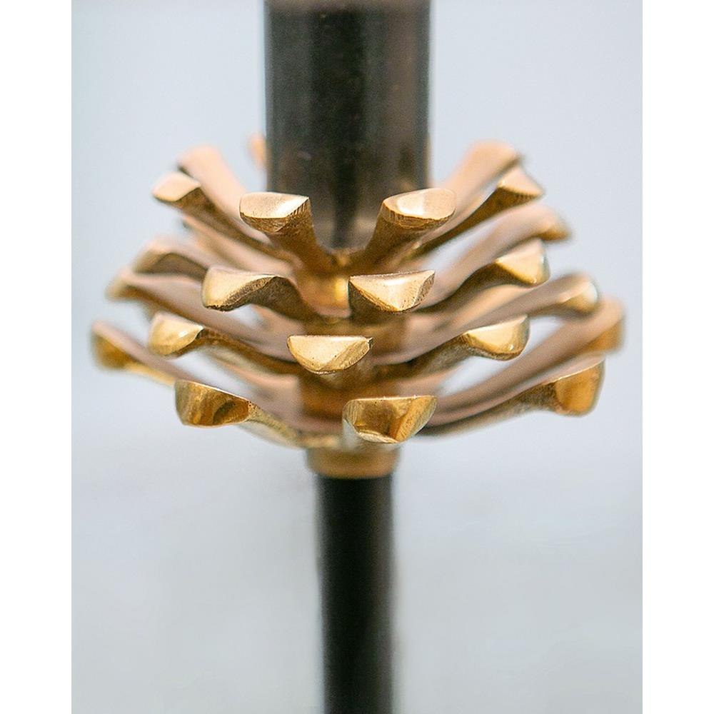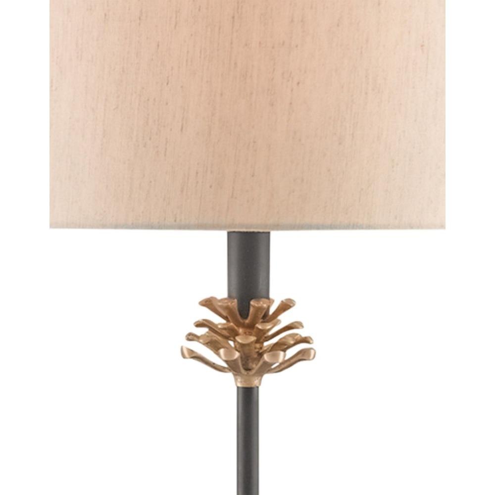 The Pinegrove Table Lamp has a black wrought iron column that extends between a spreading pinecone accent in an antique brass finish and a stacked base in brass and black granite. The beige poplin shade on the dark gray lamp is fastened by a finial in an antique brass finish.