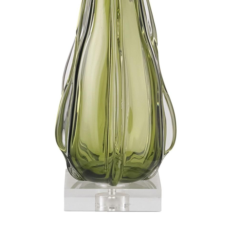 The undulant body of the Zephyr Table Lamp is organic and sculptural. The smoky green color of the glass comes to life when illumination flows onto its surface from under the off-white shantung shade. The green glass lamp sits atop an acrylic base and is fitted with a clear finial.