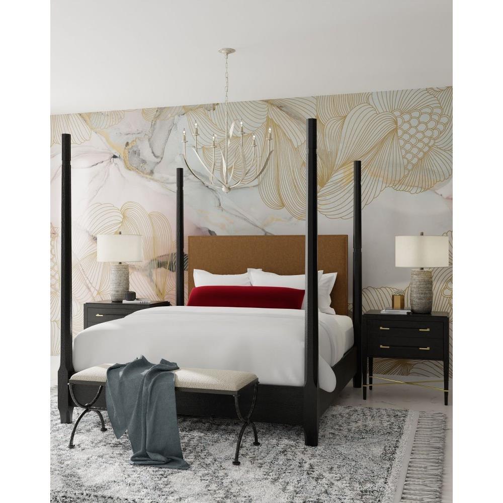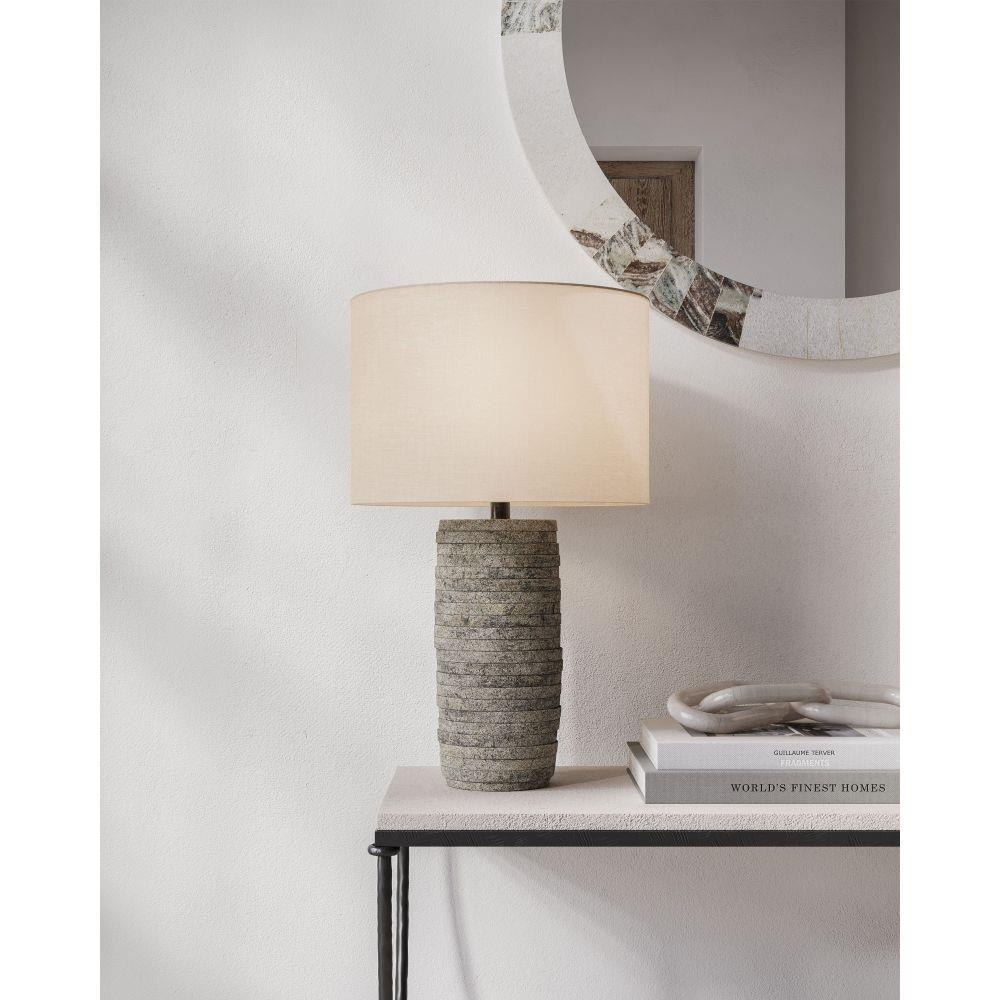 Flat discs of terracotta encircle a wrought iron spine on our Innkeeper Table Lamp. The rustic feel of this natural material means it has subtle variations in color and texture. The gray lamp is topped with a vanilla linen shade held in place by a terracotta finial.