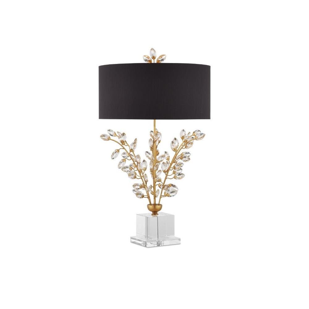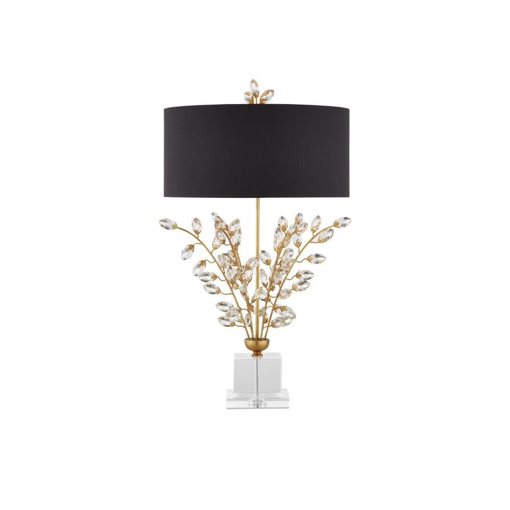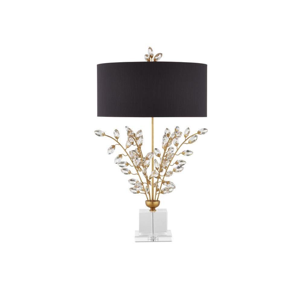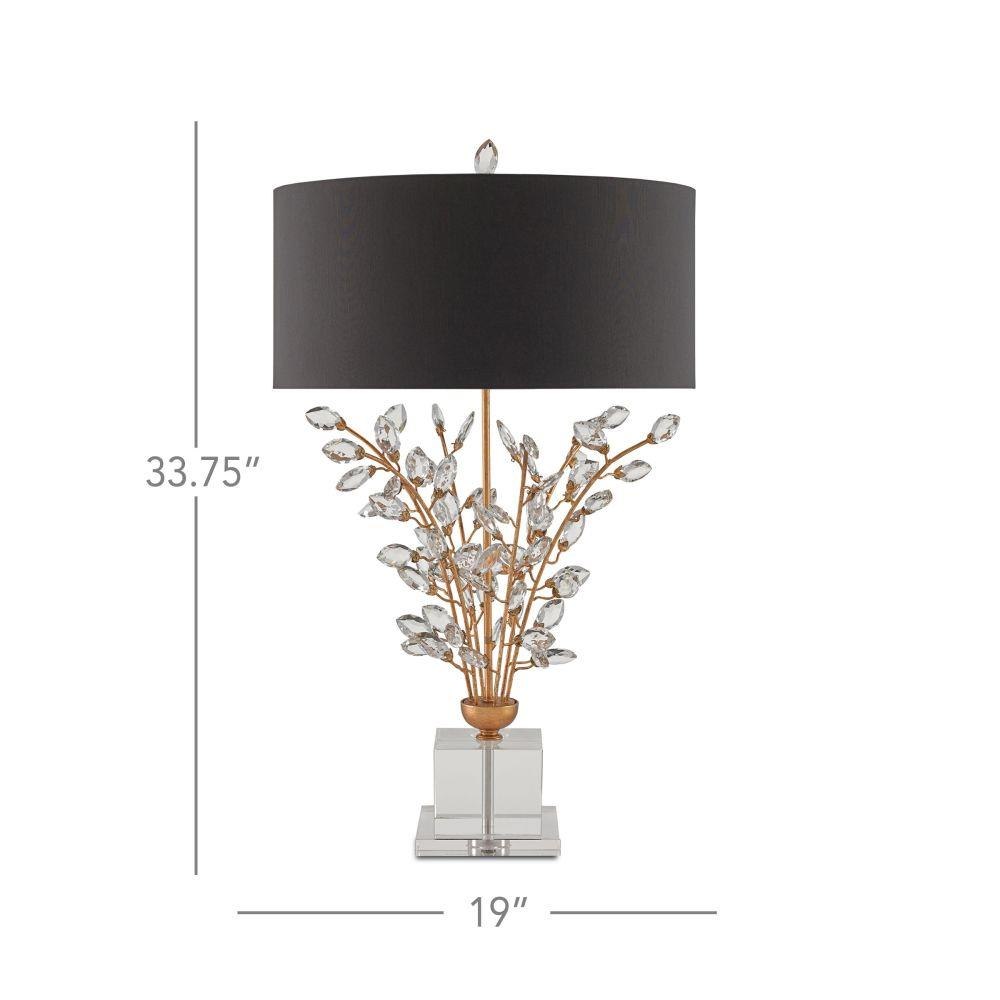 Our Forget-Me-Not Table Lamp has stems of metal in a rich Chinois gold leaf finish that hold luxuriant beveled optic crystal buds. Other notable details on this crystal lamp include a crystal finial and stacked base, and a black shantung drum shade in perfect proportion to the spray of crystals.