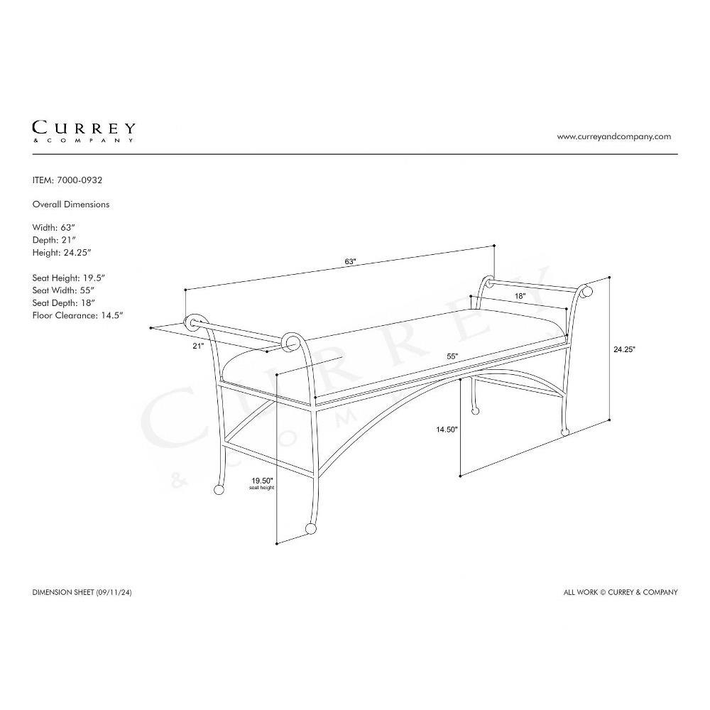 The Mabel Bench is a classic design constructed of textured steel, which has a light gold rub that shows through. Special accents are the polished brass stainless steel ball feet and arm details, as well as the way the stretchers arc up toward the seat. The upholstered top is covered in a woven brown-beige performance fabric, and the seat is a generous 55 inches wide.
