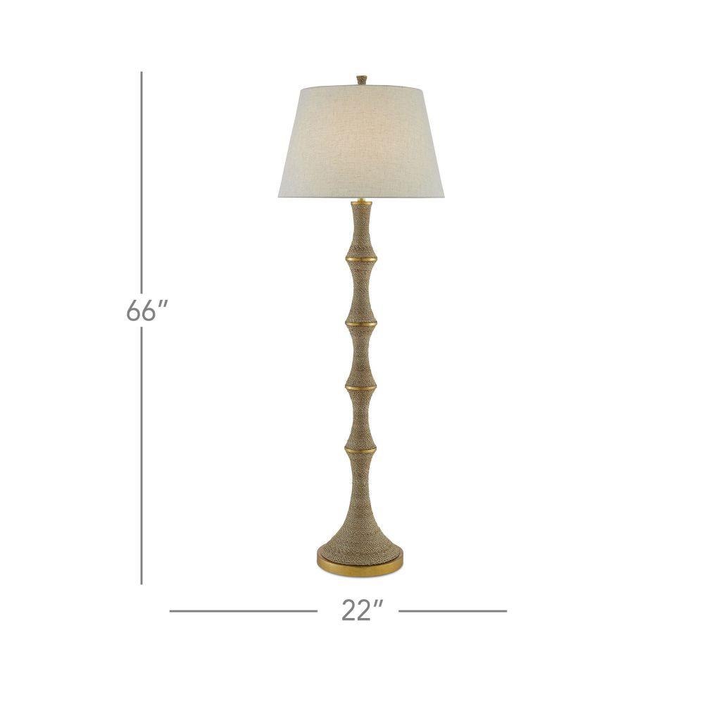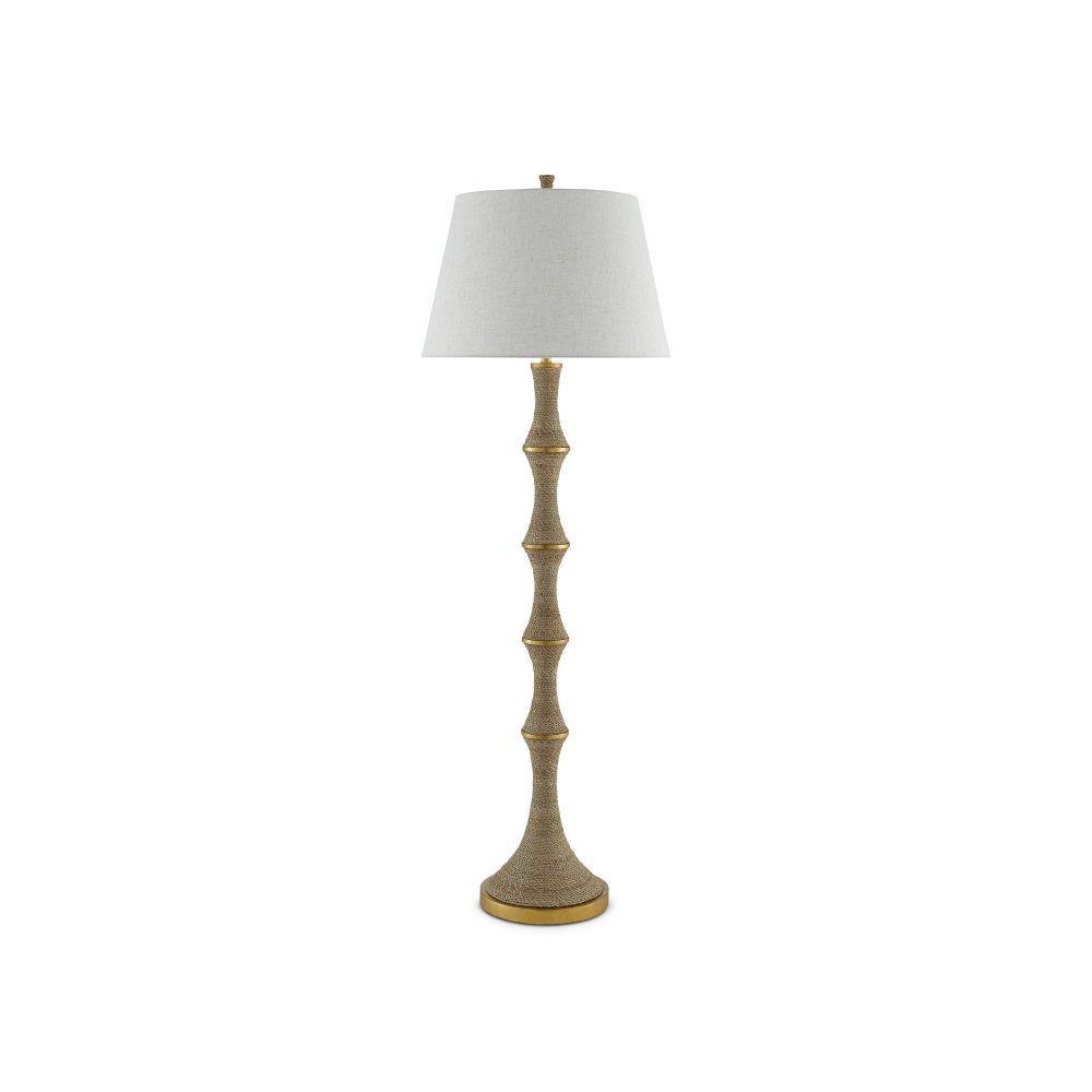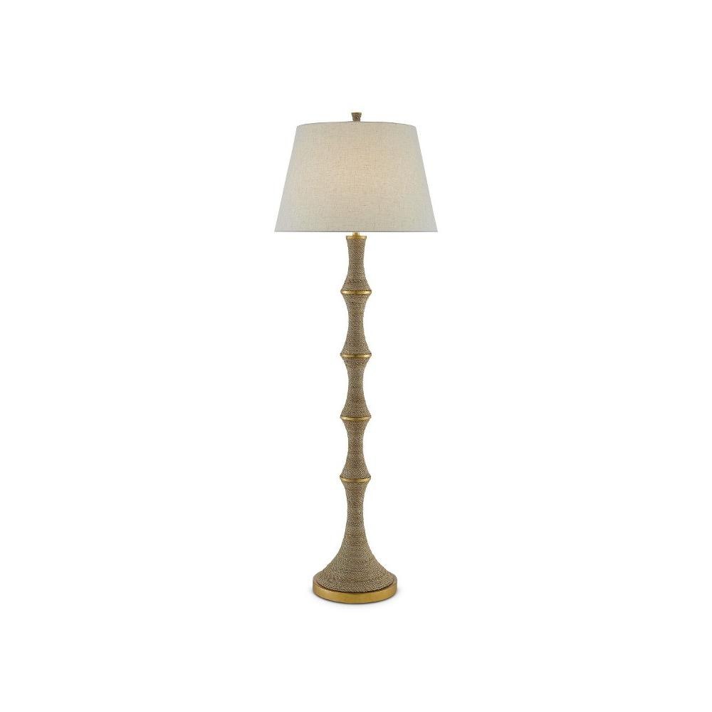 An intermingling of materials brings the Bourgeon Floor Lamp its sophistication. Wrapped in Abac+í rope, the matte sections along the stem are divided by metal circlets in a dark contemporary gold leaf finish that gleam when light strikes them. We've topped this tan floor lamp with a beige poplin cotton shade.