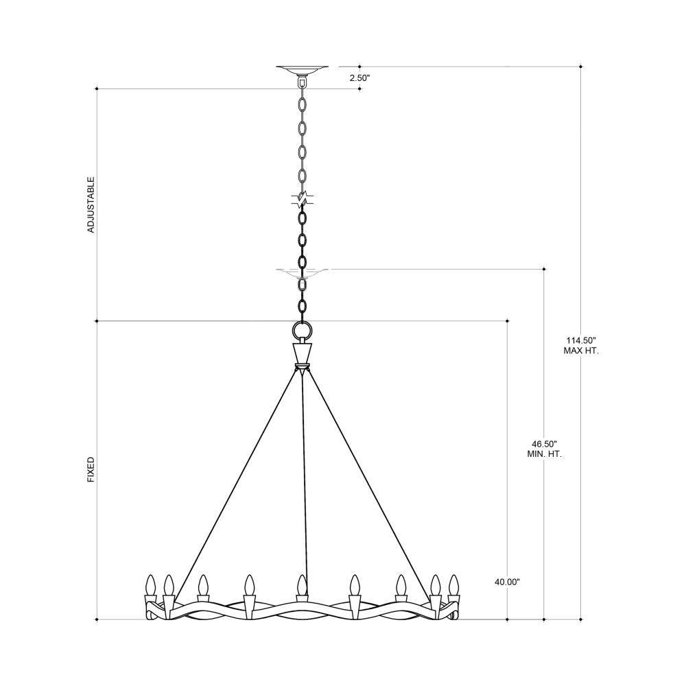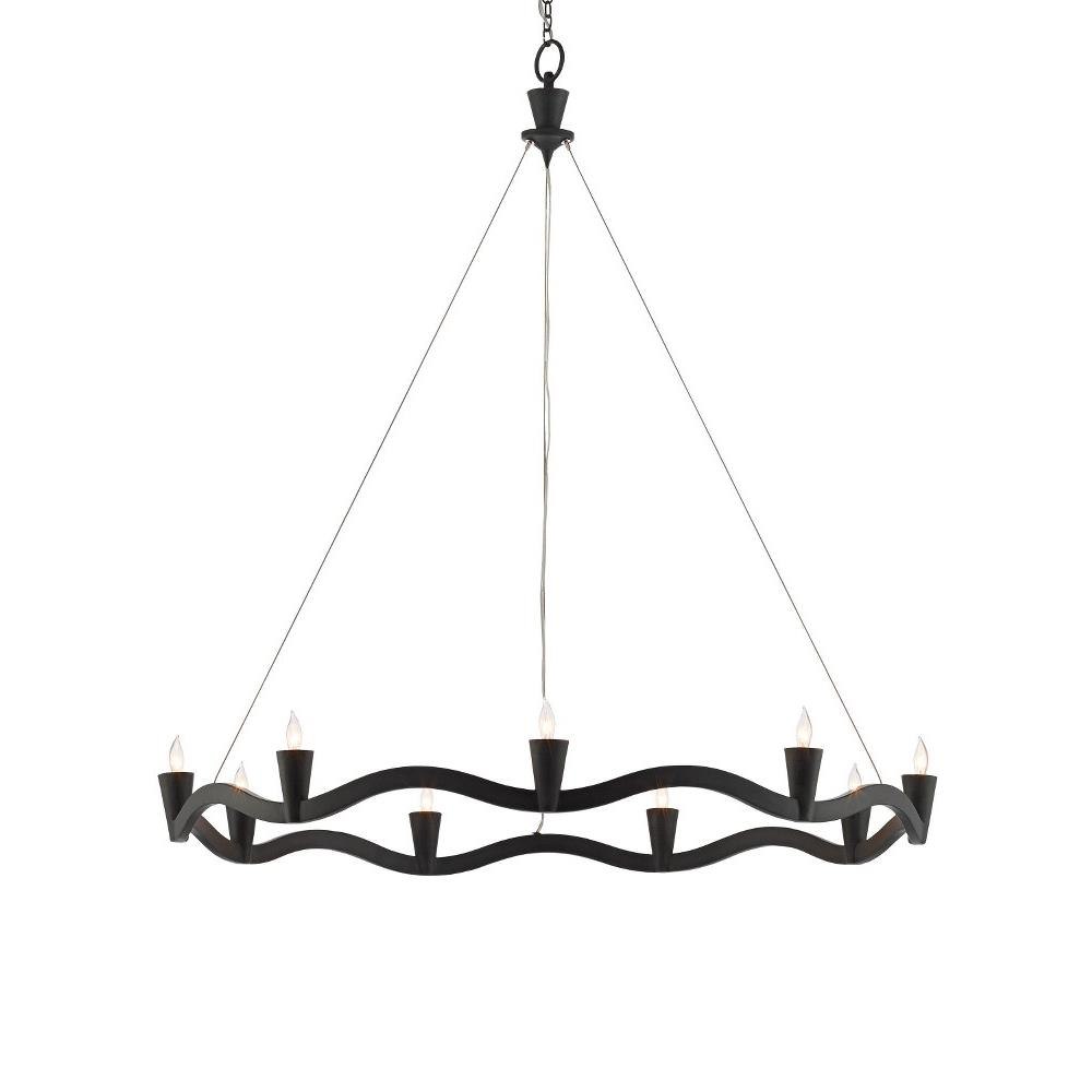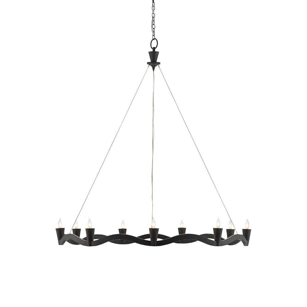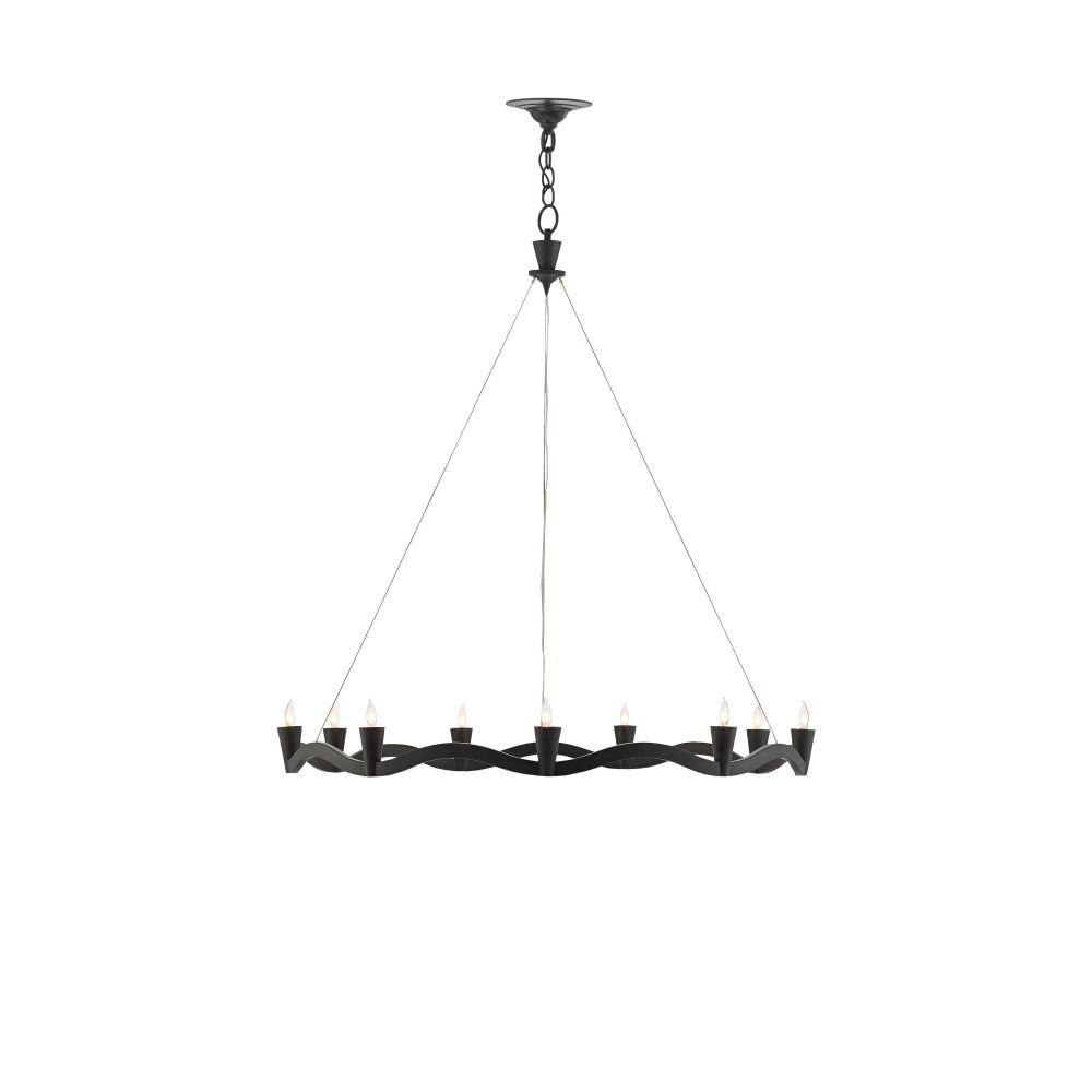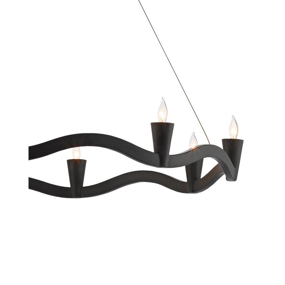 Our Serpentina Chandelier is made of wrought iron in an antique black finish. The lightness of this design stems from the aircraft cable that suspends the serpentine bottom ring from the plumb bob-like top cap on this black chandelier.