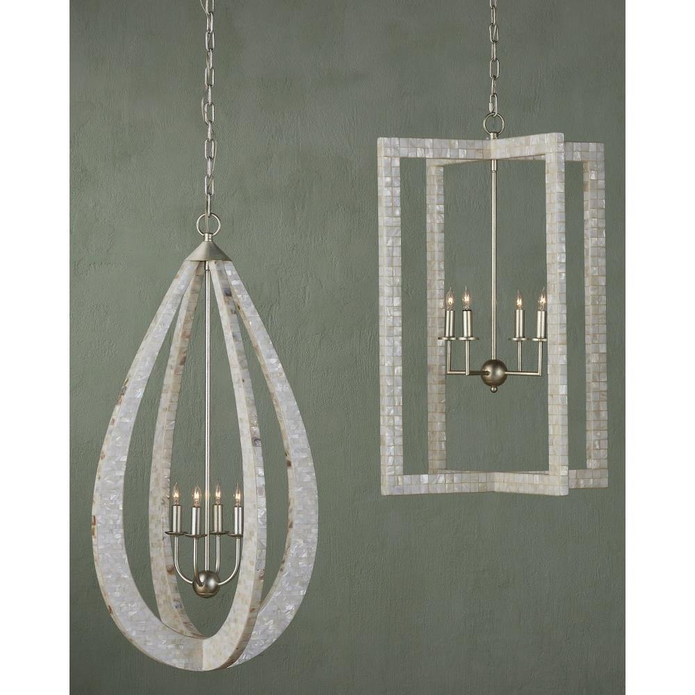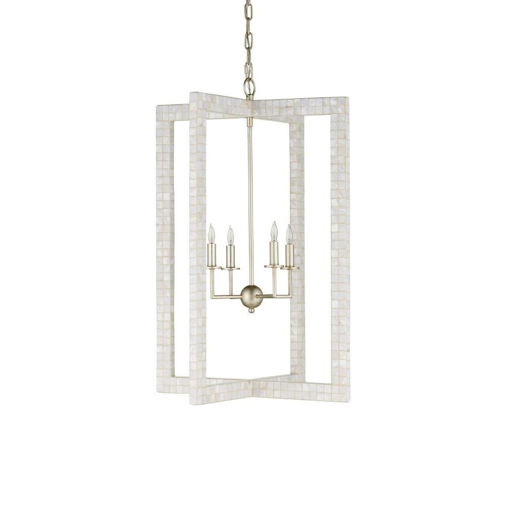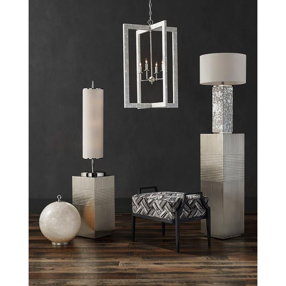 With thin rectangles covered in hand-applied mother-of-pearl mosaic, our Arietta Chandelier is an example of how talented our finish artisans are when it comes to handcrafted surfaces. The metal in a contemporary silver leaf finish enhances the glow of the fixture when the four lights of the silver chandelier illuminate.