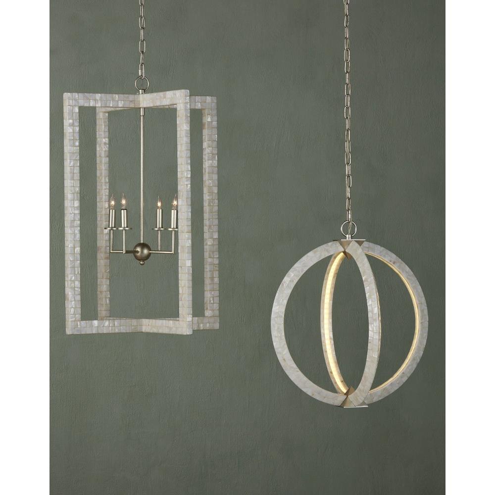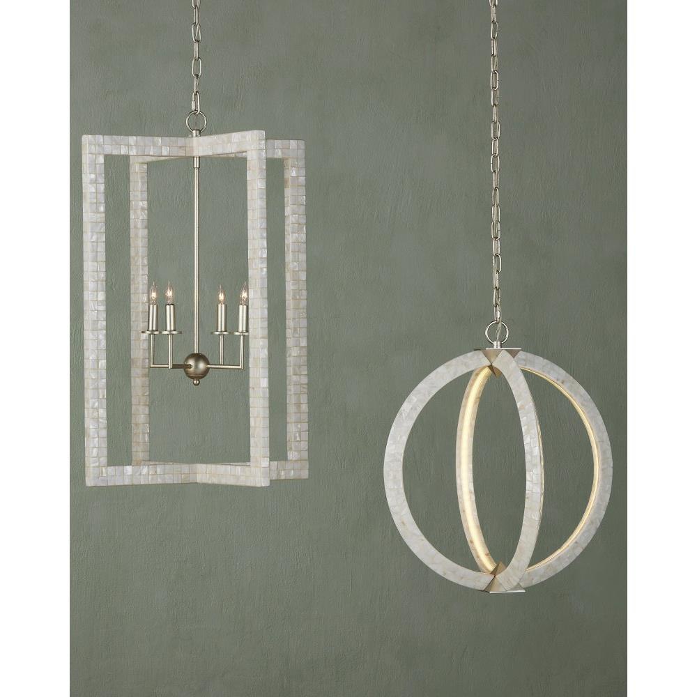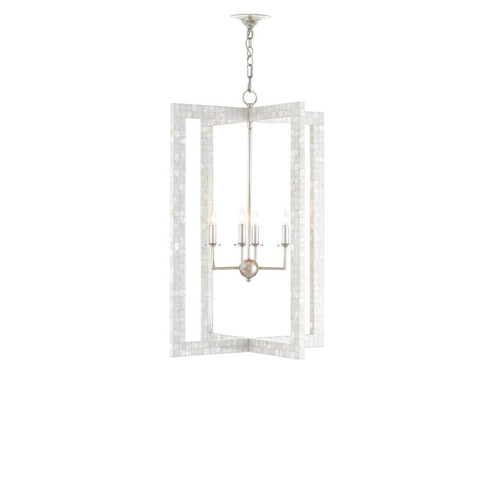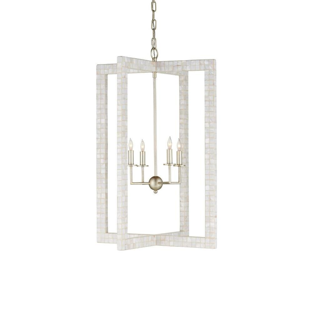 With thin rectangles covered in hand-applied mother-of-pearl mosaic, our Arietta Chandelier is an example of how talented our finish artisans are when it comes to handcrafted surfaces. The metal in a contemporary silver leaf finish enhances the glow of the fixture when the four lights of the silver chandelier illuminate.