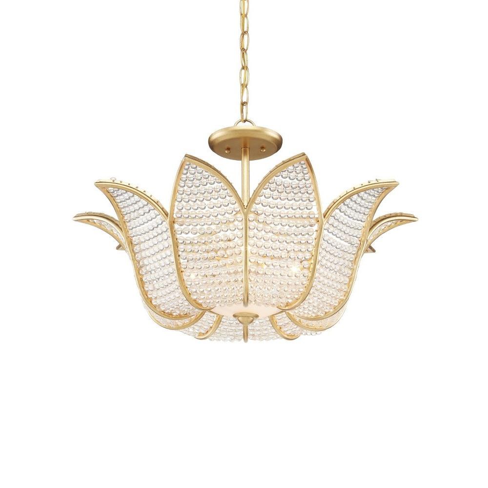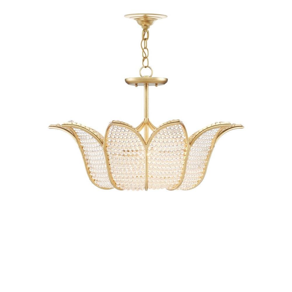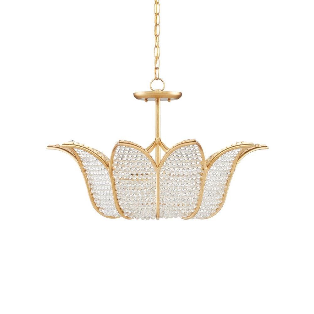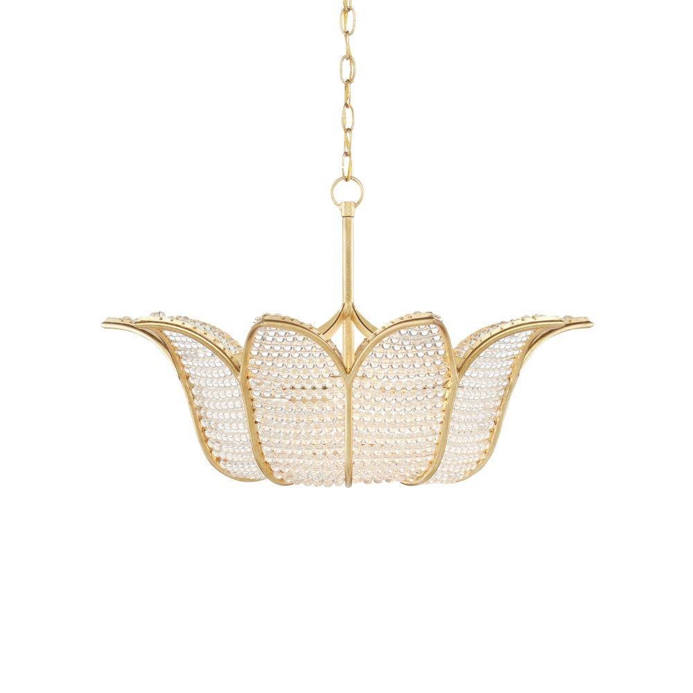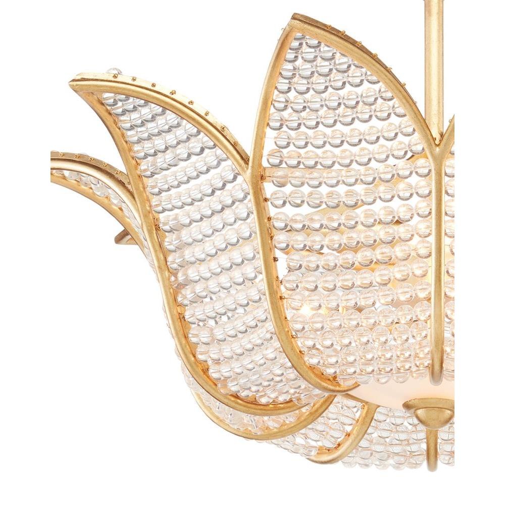 A throw-back to a time when formal salons were the most popular gathering spots for the elite, the Bebe Chandelier designed by Bunny Williams has a wrought iron tulip-shaped frame in a contemporary gold leaf finish strung with clear glass beads. The light effervesces when it passes through the small glass globes to soften the illumination that flows from this gold chandelier.