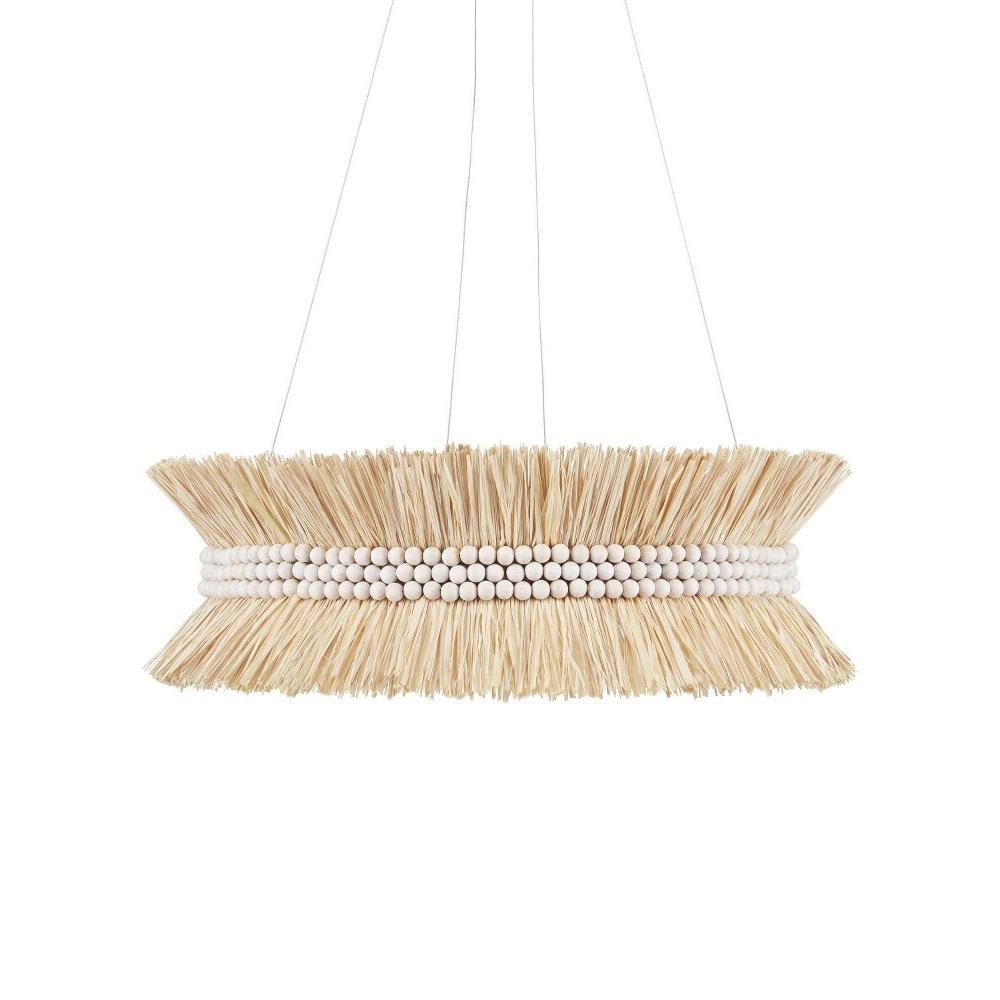 Take a trip to the beach with Jamie Beckwith. Her Seychelles Chandelier, which joins her collection of lighting, was inspired by an island-hopping vibe. The frame is made of wrought iron in a sugar white finish. From this extends hand-cut sprays of raffia that are cinched by three rows of pale hand-strung wood beads. When light wafts through the strands of the natural material harvested from palm trees, a warm glow is emitted. The aircraft cable from which the tan chandelier is hung keeps the composition airy.
