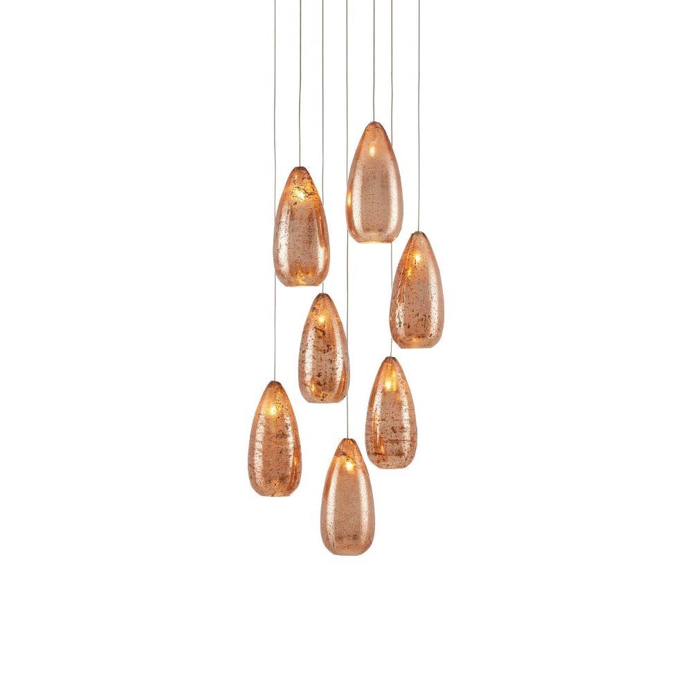 The Rame 7-Light Multi-Drop Pendant has teardrop shaped shades made of mercury glass with silver on the inside and copper on the outside. The personality of the patterns on the glass is evident whether the lights are switched on or not but when illumination brightens the shades, the effect is dazzling. The thinness of the stems on which they hang and the lightness of the painted silver finish make the oblong shades seem to float. We offer the Rame in a number of different configurations with multiple shades.