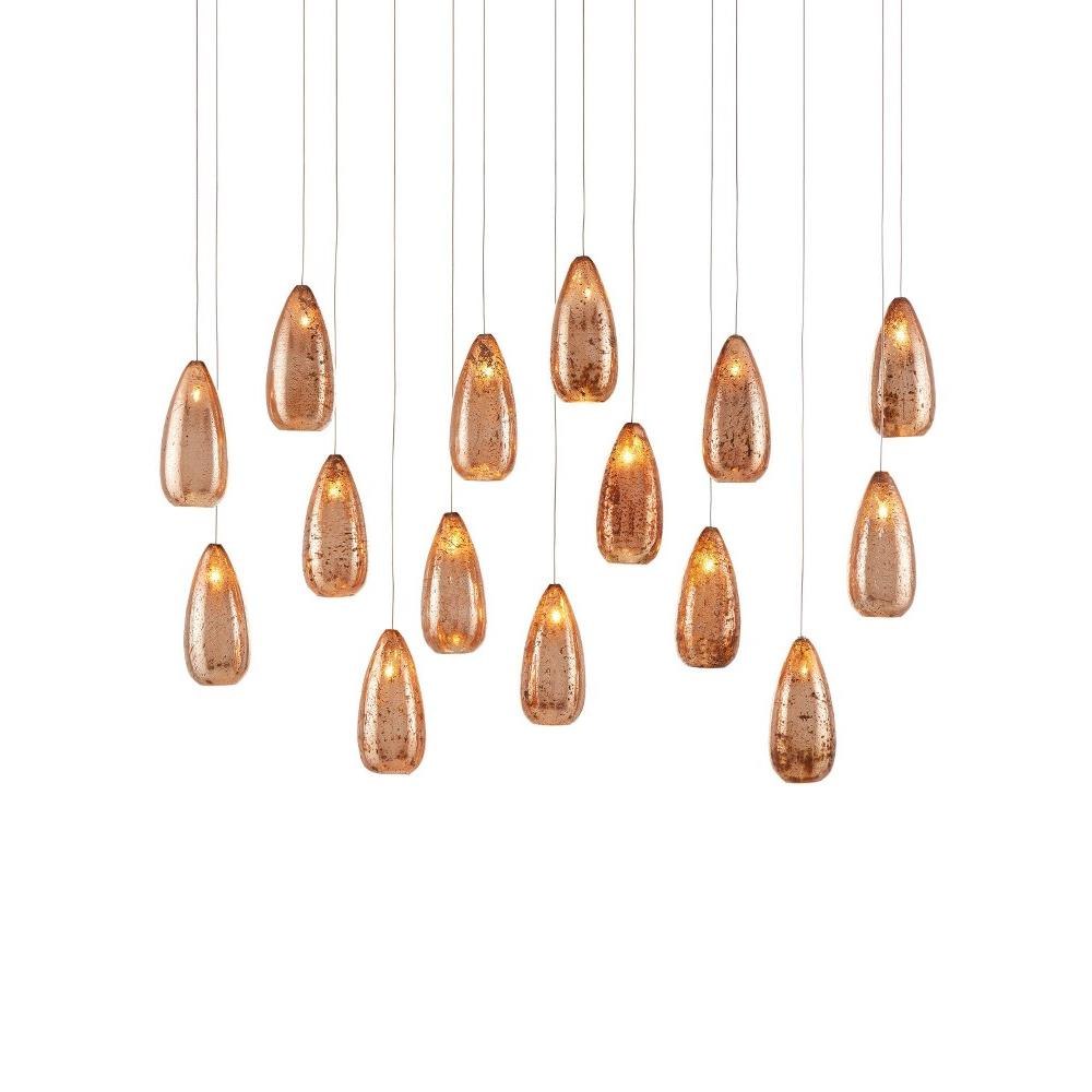 The Rame Rectangular 15-Light Multi-Drop Pendant has teardrop shaped shades made of mercury glass with silver on the inside and copper on the outside. . The personality of the patterns on the glass is evident whether the lights are switched on or not but when illumination brightens the shades, the effect is dazzling. The thinness of the stems on which they hang and the lightness of the painted silver finish make the oblong shades seem to float. We offer the Rame in a number of different configurations with multiple shades.