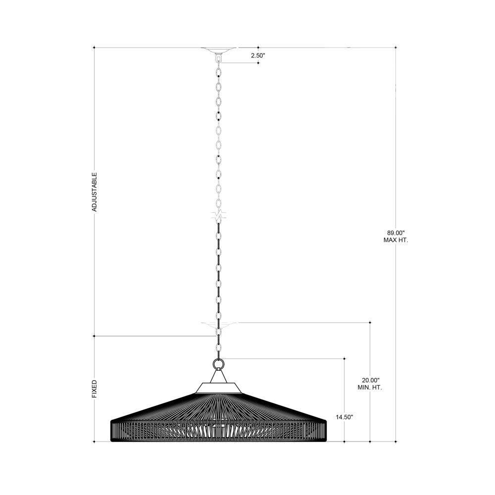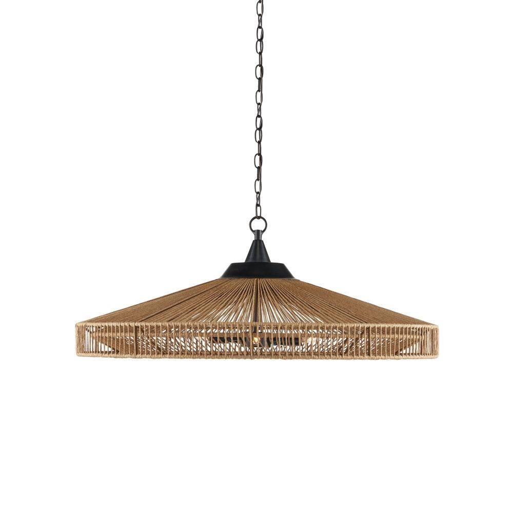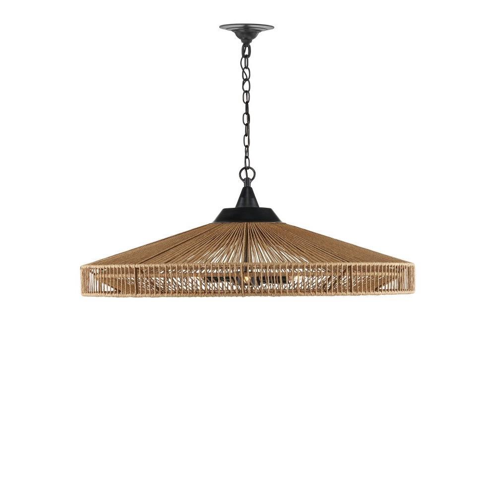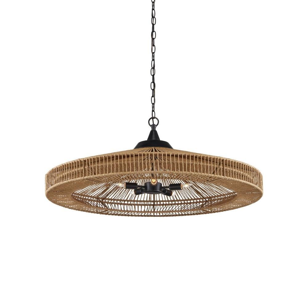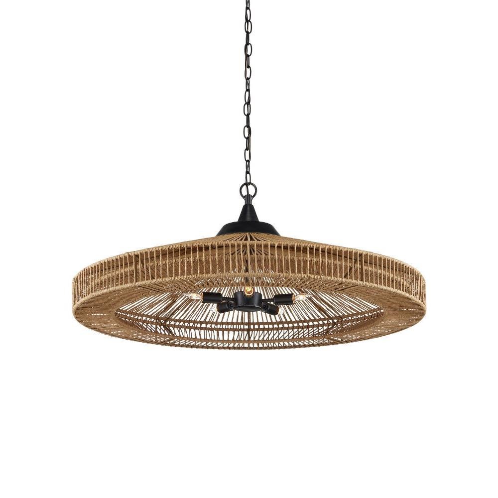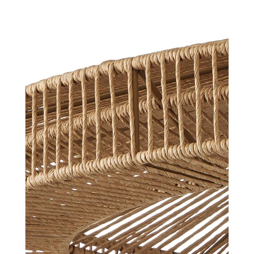 The Maldives Chandelier is made of wrought iron in a mix of satin black and khaki finishes to make this fixture a shoe-in for a black and natural style approach. The rope-like cage that surrounds it, made of Kraft paper twine, is woven to the frame in two layers, the one closest to the light source more concentrated to diffuse the light. The rope chandelier is fitted with five bulbs to make it a luminous fixture.