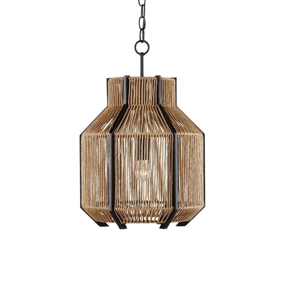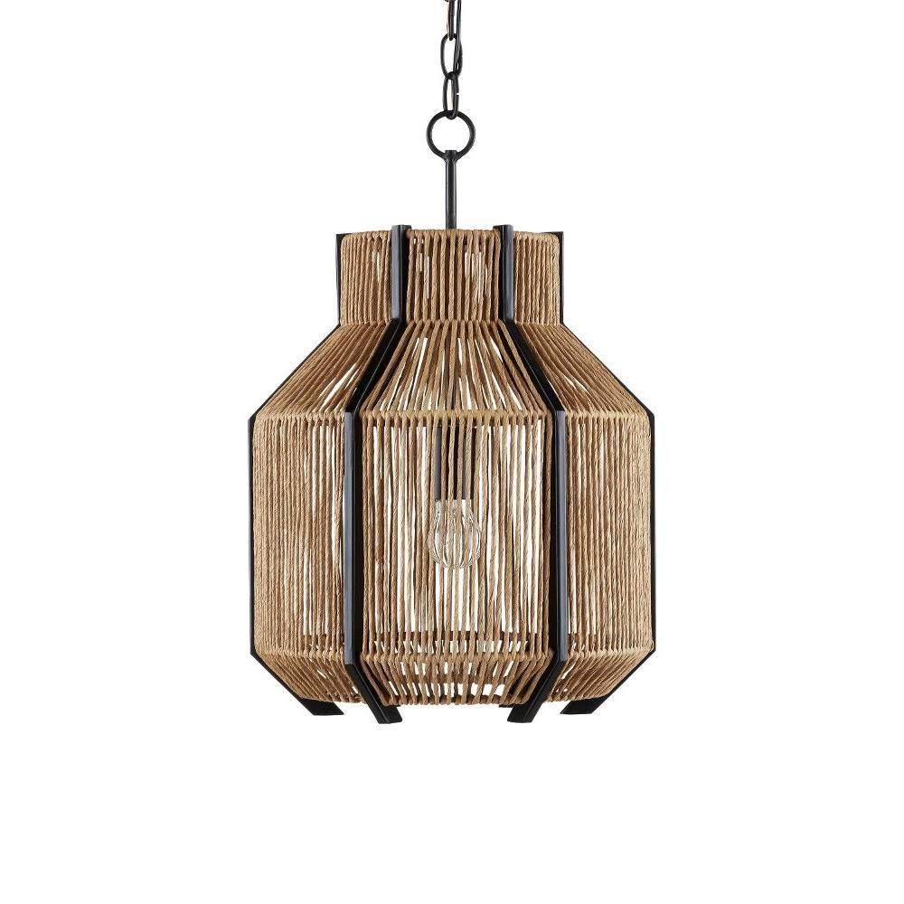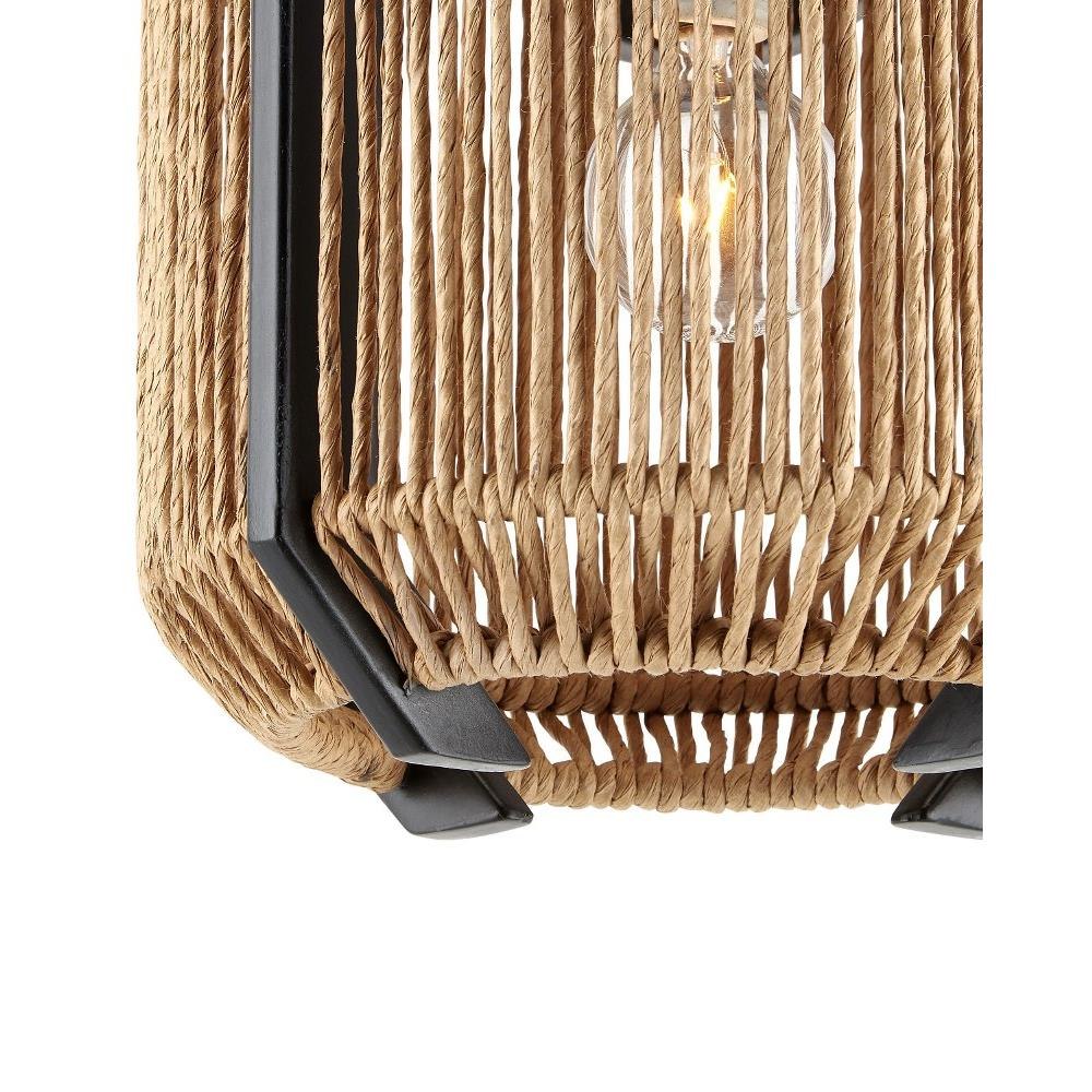 The Mali Pendant, designed by Clarence Mallari, has a complex interplay of sleek and earthy elements. The lines that rise above and below the natural woven shade of the rope pendant are made of wrought iron in a satin black finish, as are the chain from which it is hung and the hardware that holds the bulb. These are the clean-lined elements that contrast the Kraft paper twine, which is tightly woven but not so dense that it interrupts the warm glow of illumination from its interior.