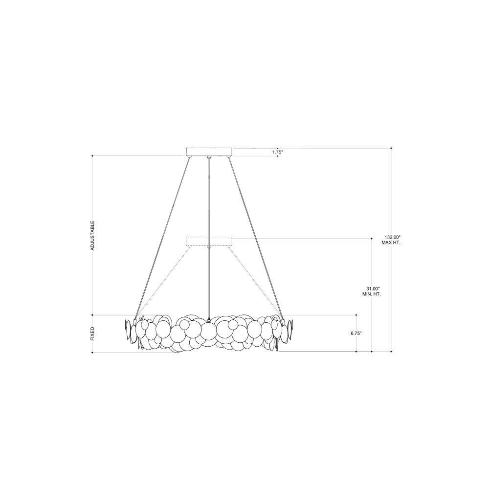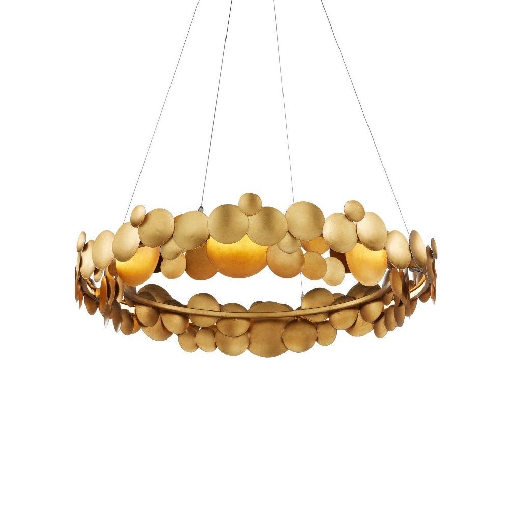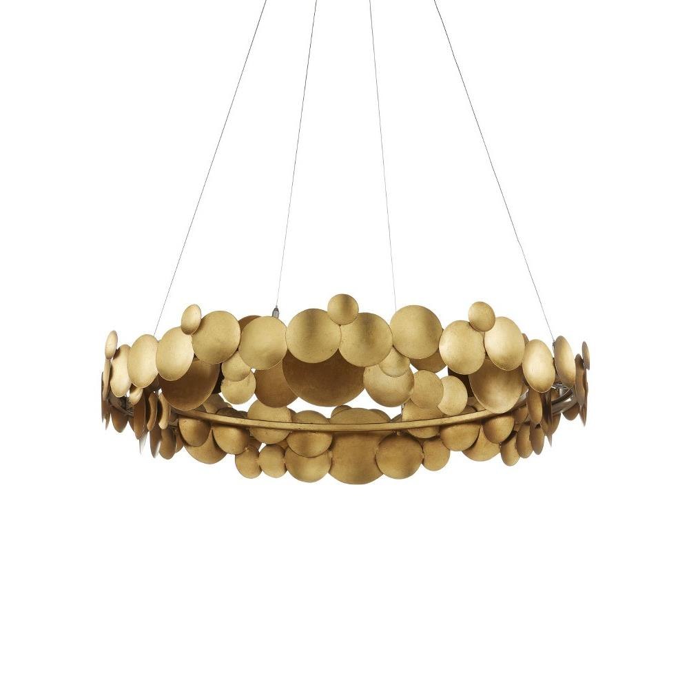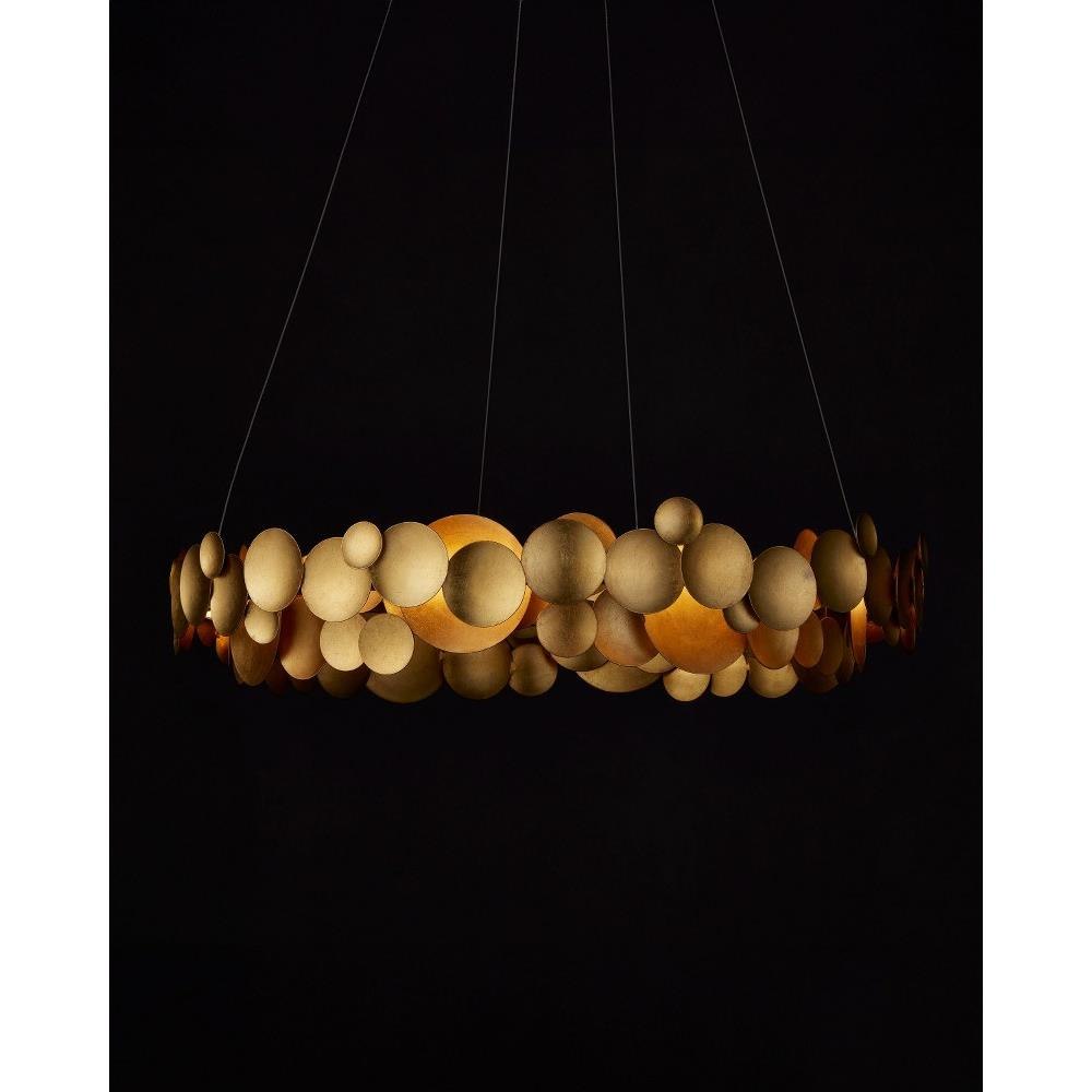 The Lavengro Chandelier is a layered design with a tremendous amount of charm. Wrought-iron discs in varying sizes are stacked in meandering patterns to make up the shade. The contemporary gold leaf finish on the discs and the central bar to which these are fastened gleam warmly whether the lights are switched on or not. This modern design by Clarence Mallari is innovative, as well, as it is lit by integrated LED technology.