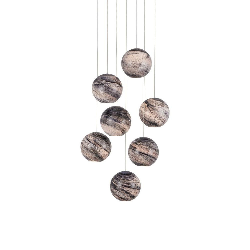 The shade of the Palatino 1-Light Multi-Drop Pendant gives the impression it is its own complete universe replete with its own Milky Way. Made of two layers of glass - the interior white and the exterior blue - the shade shimmers with Mica dust that is tossed onto the surface of the molten glass, which is twisted to achieve the swirls that mimic the wonders of the night sky. The surface glimmers even when the light is switched off. The canopy of this piece is luminous in a painted silver finish. This fixture is among Currey & Company's multi-drop pendant collection, which includes multiple configurations.