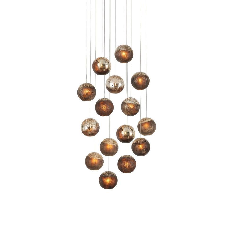 The Pathos Round 15-Light Multi-Drop Pendant dangles shades that are true works of art. The orbs have been doused in reactive glazes that make their special qualities known in the antique gold on the top and matte charcoal on the bottom, which will look different when illumination flows through them. The beads on the top were melted into the molten glass just before it cooled to bring even more effervescence the design. This is definitely a fixture for anyone who appreciates individual elements made by hand. The canopy of this piece is luminous in a painted silver finish. This fixture is among Currey & Company's multi-drop pendant collection, which includes multiple configurations.