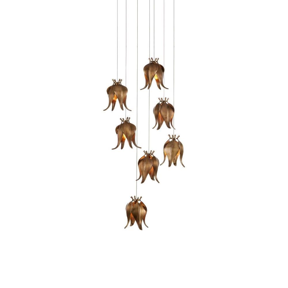 The Iota Round 7-Light Multi-Drop Pendant has shades that exude the beauty of flower buds, though they are not made of plant matter as their lovely profiles would suggest; they are fashioned from brass in a warm antique brass finish. A particular design detail of note is the delicacy and positioning of the petals. The canopy of this piece is luminous in a painted silver finish. This fixture is among Currey & Company's multi-drop pendant collection, which includes multiple configurations.