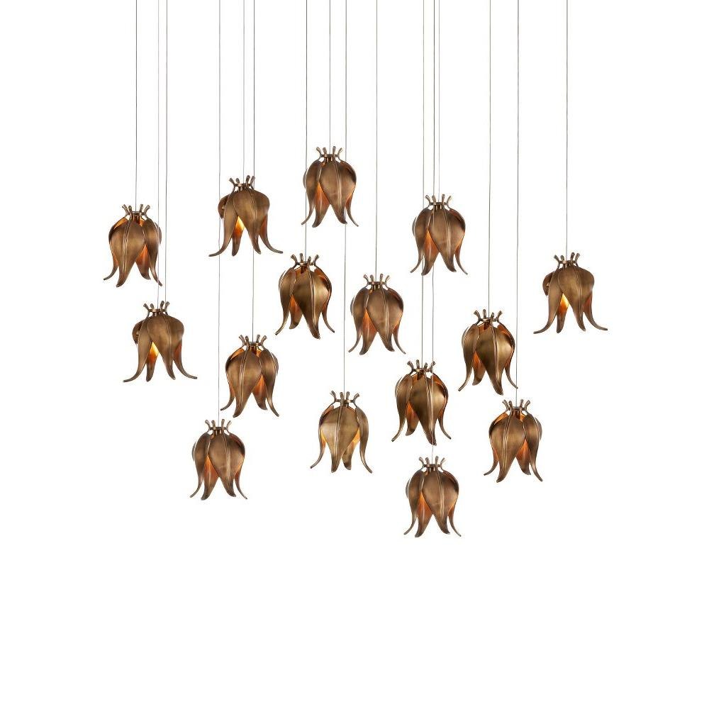 The Iota Rectangular 15-Light Multi-Drop Pendant has shades that exude the beauty of flower buds, though they are not made of plant matter as their lovely profiles would suggest; they are fashioned from brass in a warm antique brass finish. A particular design detail of note is the delicacy and positioning of the petals. The canopy of this piece is luminous in a painted silver finish. This fixture is among Currey & Company's multi-drop pendant collection, which includes multiple configurations.