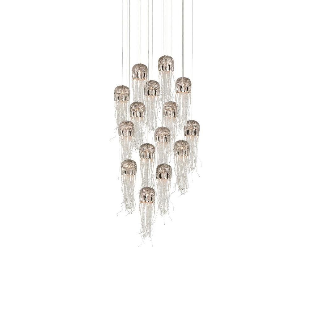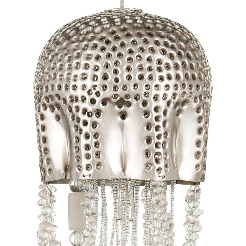 The Medusa Round 15-Light Multi-Drop Pendant effervesces with echoes of the deep sea. Beads cascading from its dimpled shades in a nickel finish mimic the profile of a jellyfish, one of nature's most mysterious creatures. The beads are threaded by hand and the cap is hand-punched, a mix of tasks that are painstakingly involved. These highlight the skills of the craftspeople who make our most artful products. The beads took on added paleness once they were sandblasted before being attached. The canopy of this piece is luminous in a painted silver finish. This fixture is among Currey & Company's multi-drop pendant collection, which includes multiple configurations.