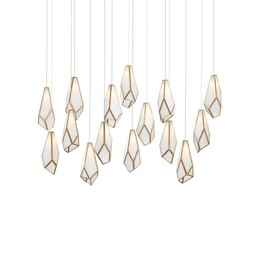 The faceted shades of the Glace White Rectangular 15-Light Multi-Drop Pendant are made of panes of white art glass joined with seams of metal in an antique brass finish. The organic shape of the shades and the fact they hang at differing heights enhance the personality of this white pendant, which will ornament a space like a piece of jewelry. Art glass is one of the most artisanal materials that can be used, as its swirling opaque surface creates a milky glow whether lights are switched on or not. The canopy of this piece is luminous in a painted silver finish. This fixture is among Currey & Company's multi-drop pendant collection, which includes multiple configurations.