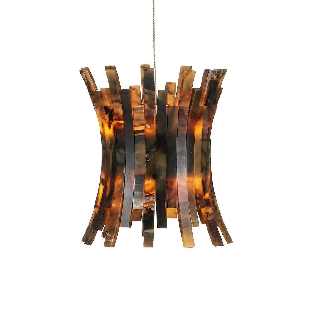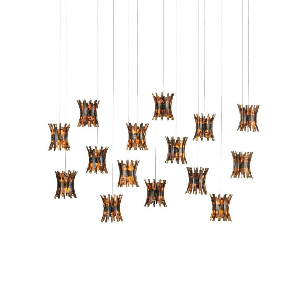 The shades of the Alsop Rectangular 15-Light Multi-Drop Pendant were inspired by tortoise shell bracelets that were popular during the era when Hollywood glamour was at its height. Made of composite with faux-horn surfaces, the shades on the brown pendant will be warm elements in a space. A refined aspect of the design is how the ribs arc outward and how they are staggered for greater texture than their surfaces bring. The canopy of this piece is luminous in a painted silver finish. This fixture is among Currey & Company's introduction of cluster lights, which includes multiple configurations.