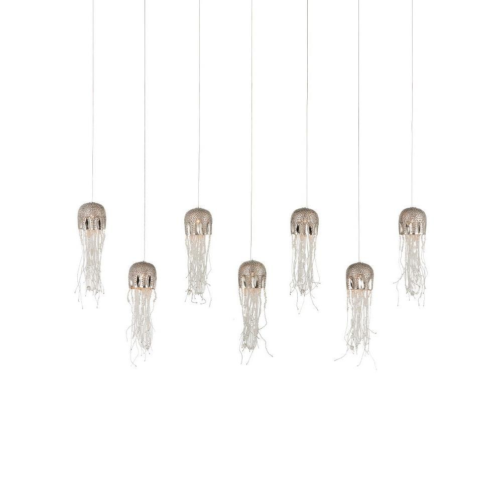 The Medusa Rectangular 7-Light Multi-Drop Pendant effervesces with echoes of the deep sea. Beads cascading from its dimpled shades in a nickel finish mimic the profile of a jellyfish, one of nature's most mysterious creatures. The beads are threaded by hand and the cap is hand-punched, a mix of tasks that are painstakingly involved. These highlight the skills of the craftspeople who make our most artful products. The beads took on added paleness once they were sandblasted before being attached. The canopy of this piece is luminous in a painted silver finish. This fixture is among Currey & Company's multi-drop pendant collection, which includes multiple configurations.