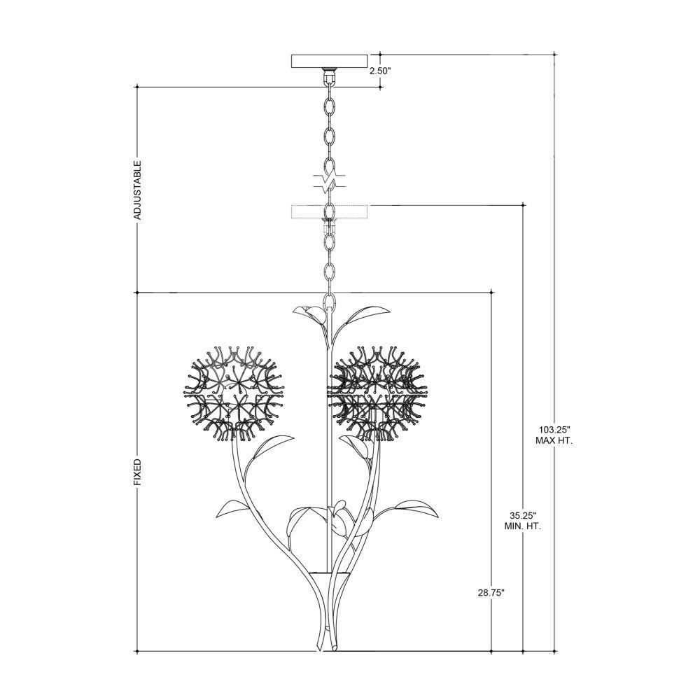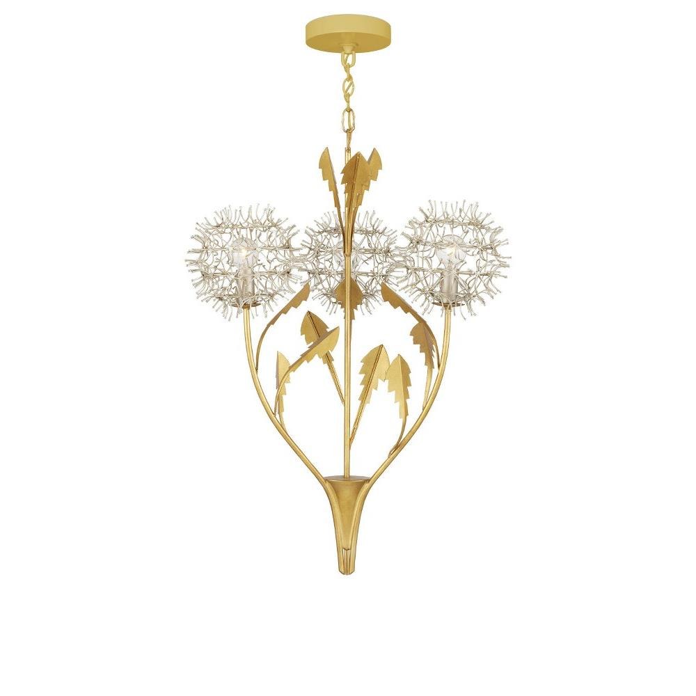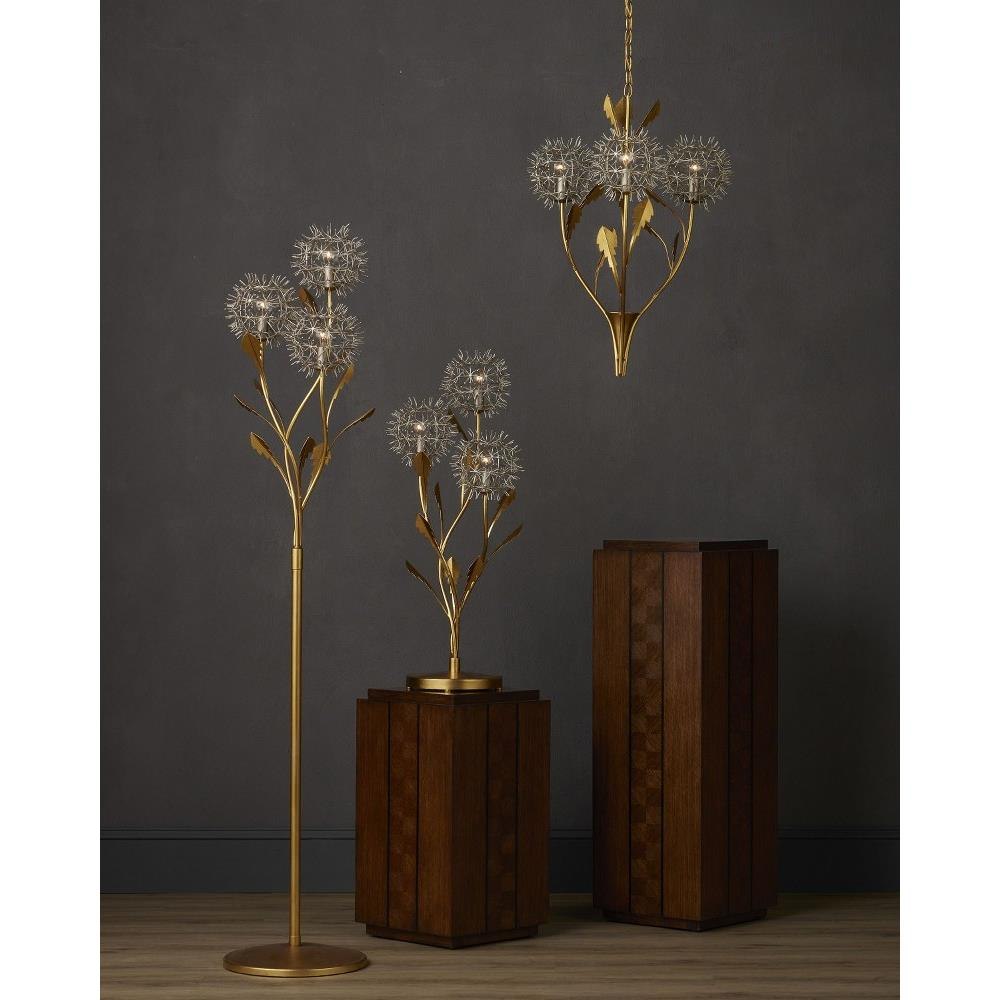 The Dandelion Silver & Gold Pendant is a masterful composition that celebrates its namesake flower. The puff-balls that surround the bulbs are made of nails that are bent and welded together, a process that is extremely labor intensive. Made of wrought iron, the pendant's bottom cone, stems, and leaves are in a contemporary gold leaf finish, while the floral elements are in a mix of contemporary silver leaf and contemporary silver finishes. This special piece expressively celebrates nature.