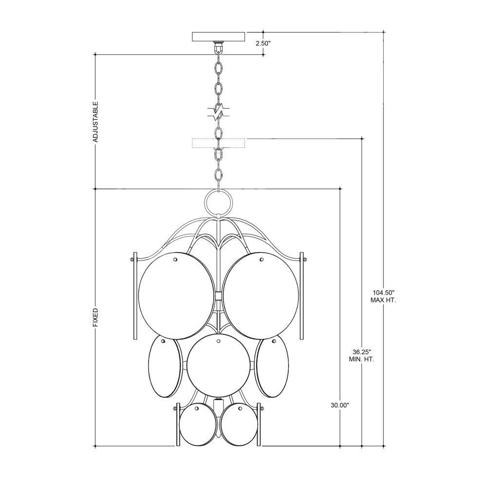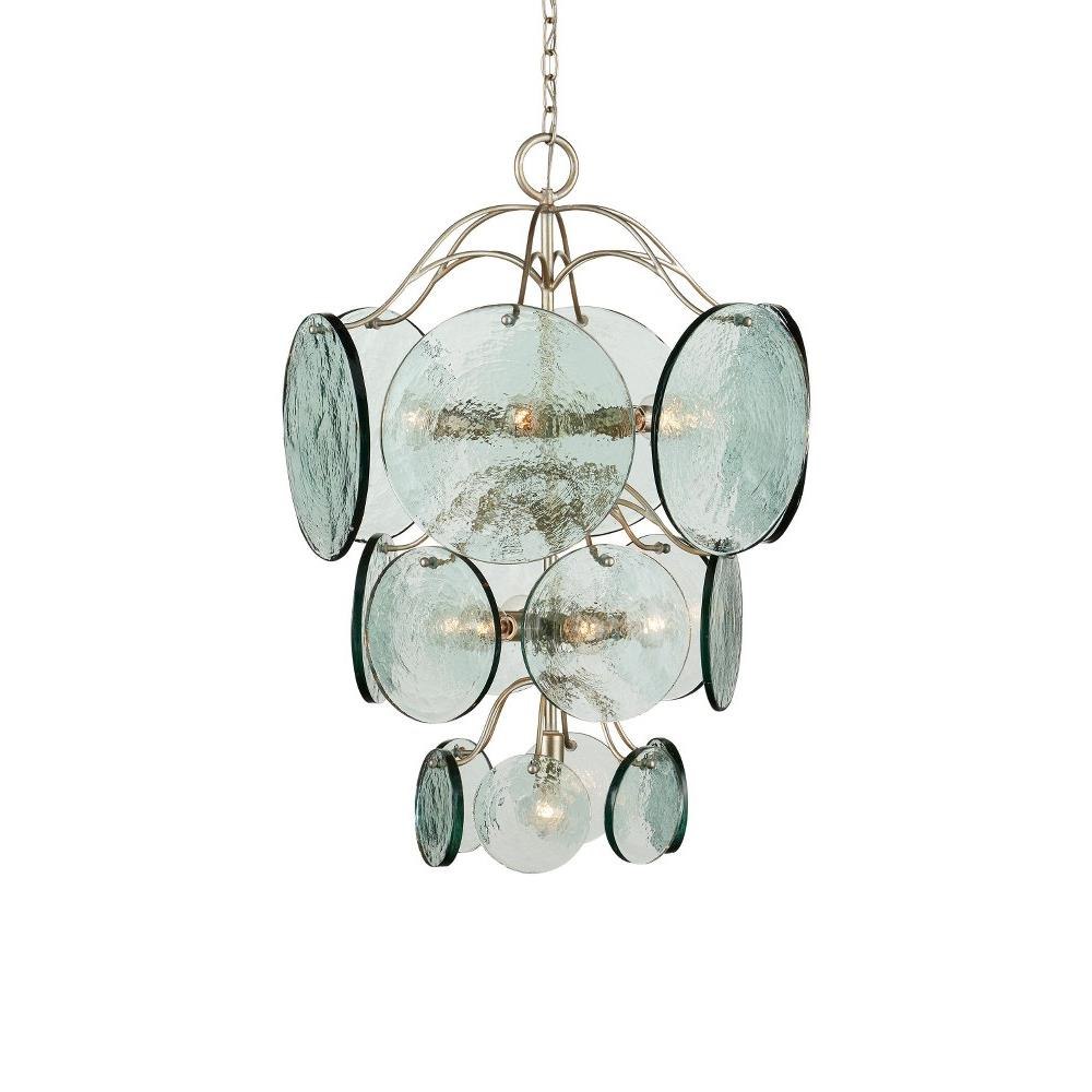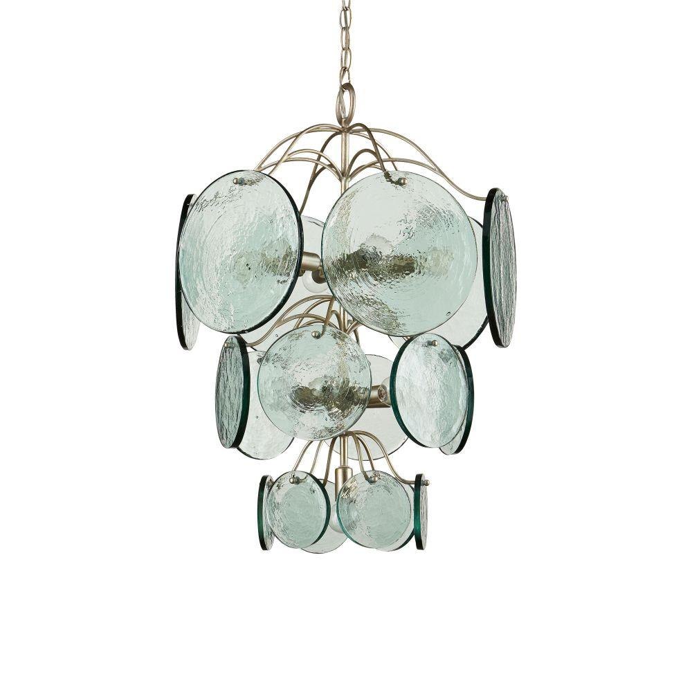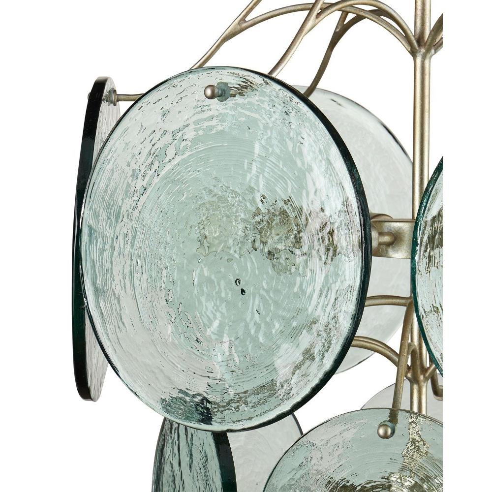 The Rovigo Chandelier has a flowing design created by the wrought iron frame to which discs of recycled glass are attached. The silver leaf finish and the textural mottled glass gleam when the lights are switched on. The silver chandelier has a contemporary feel thanks to the uniform shapes and clean edges of the discs that graduate from larger to smaller as they flow toward the bottom of the fixture.