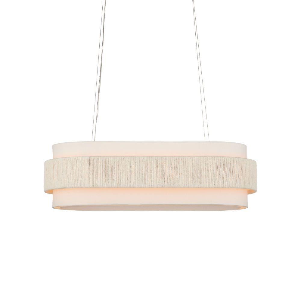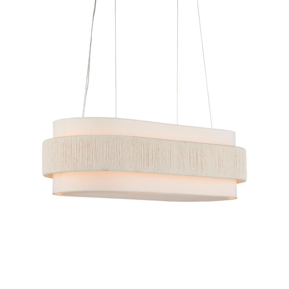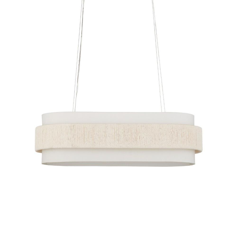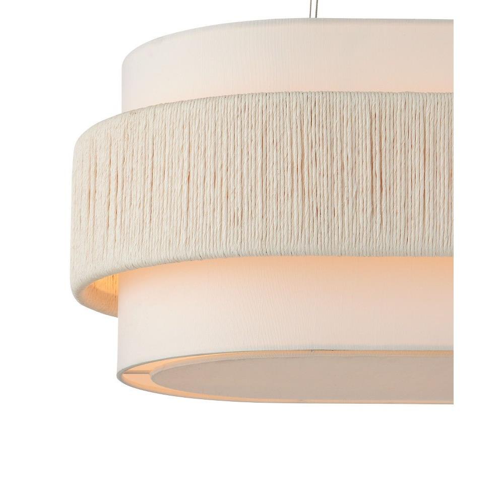 With a band made from recycled paper that has been twisted like braided hair, the Monreale Oval Chandelier has an ultra-contemporary cleanness to its design. The paper, which is painted white, is wrapped around the middle of an off-white shantung shade. The canopy is finished in a Sugar White that contributes to the lightness of this white chandelier. The bottom of the shade is fitted with a diffuser to soften the glow.