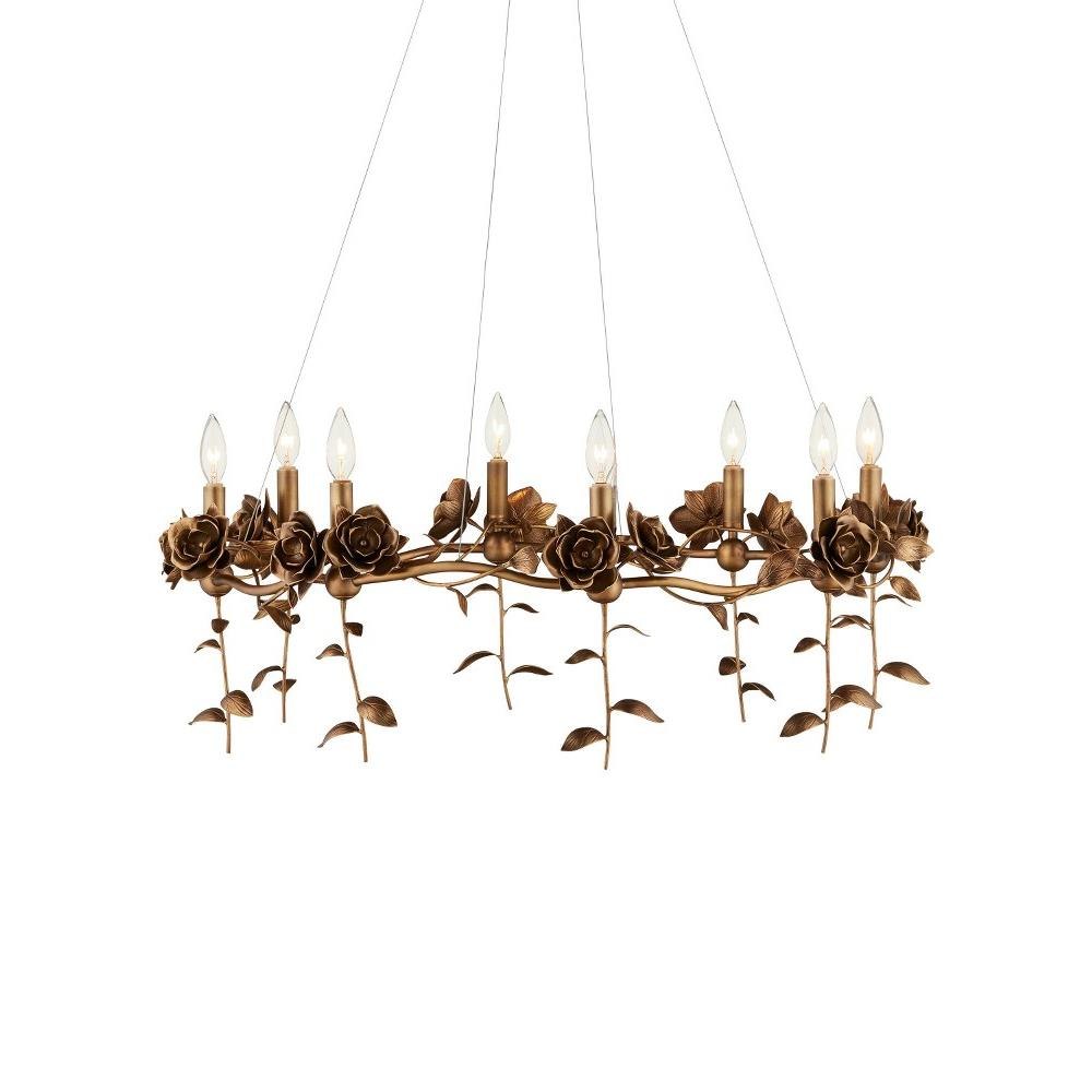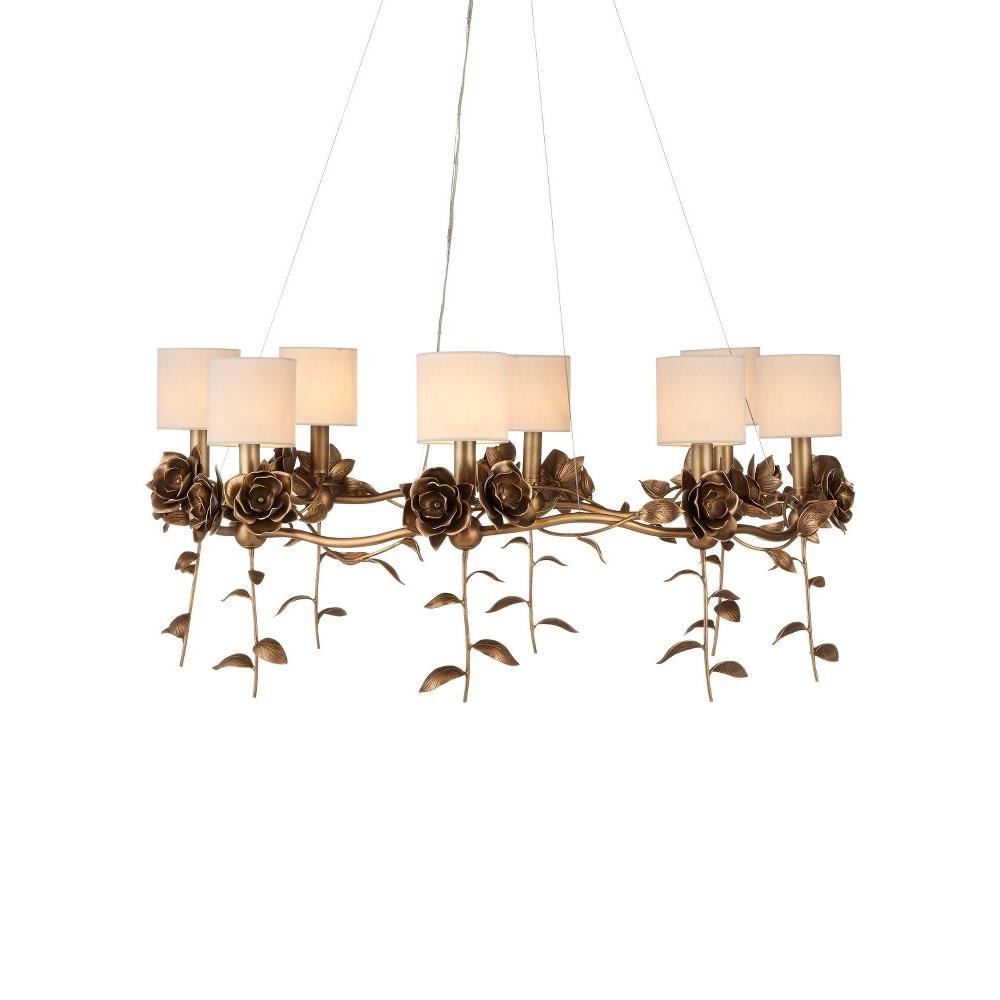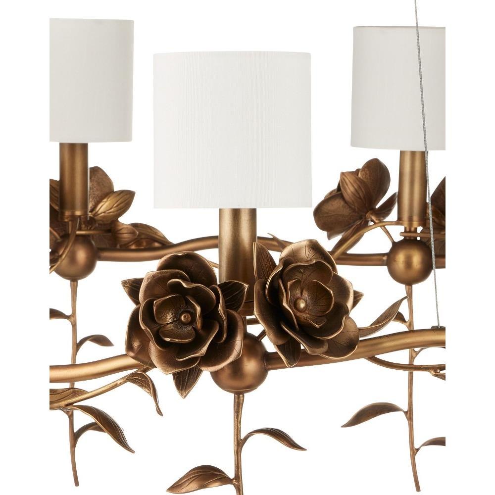 The Rosabel Chandelier is a bouquet of delight designed by Tom Caldwell. By placing the blooms along the undulant stem and designing the leaves to float downward, he created a whimsical gold chandelier that is nature-inspired, but seriously sophisticated. The roses and leaves are fashioned from brass in an warm antique brass finish. The white shades and the nostalgic motifs make this a terrific choice for both traditional and transitional interiors.