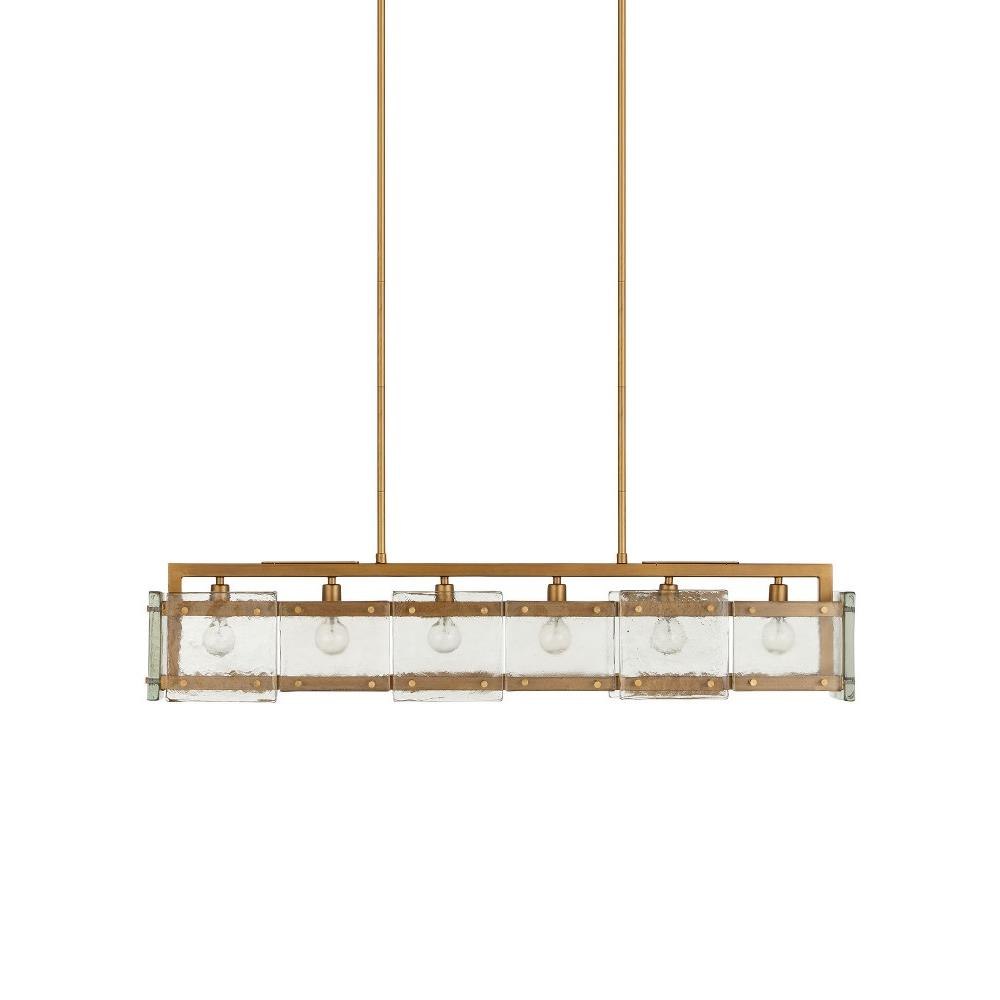 Clarence Mallari designed the Countervail Rectangular Chandelier with its panes of thick cast glass. The textural surfaces were the inspiration for this piece because the mottled nature of the glass enhances the glow of the chandelier. Each piece of the material that is fastened to a metal frame in an antique brass finish is unique. Mallari designed the panes to be fastened in place with sophisticated screws, which makes each piece removable.