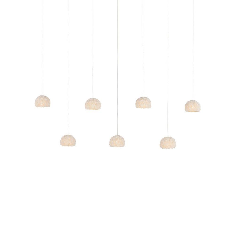 The Virtu 7-Light Rectangular Multi-Drop Pendant has beautifully composed shades around which clamrose shells are fashioned to look like rosebuds; each petal hand-placed to make this an artisanal offering. The way the illumination wafts through the shade and surrounds the shells is a design detail of note with this lovely nature-inspired luminary.
