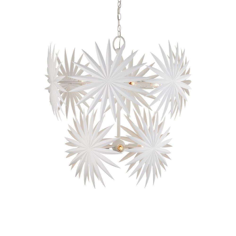 The Bismarkia Medium Chandelier was inspired by the noble Bismarkia palm, with its oversized fronds. Marjorie Skouras, who designed the chandelier, has stayed true to her love of nature for this creation. Her passion for the Yucatan, the surroundings in which she lives and through which she translates the flora and fauna into dynamic products in her studio, shines in this steel fixture covered in gesso white. The spiky ornamentations that splay around the bulbs bring immediate texture to the white chandelier. Adjustable from 39" to 107" with use of included chain/rod kit/cable. If your space calls for a longer drop, additional chain/rods/cable is available for purchase.