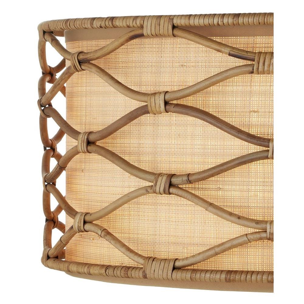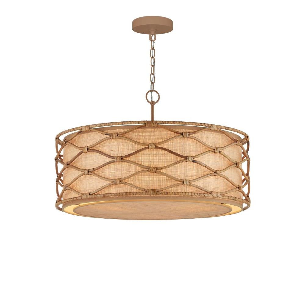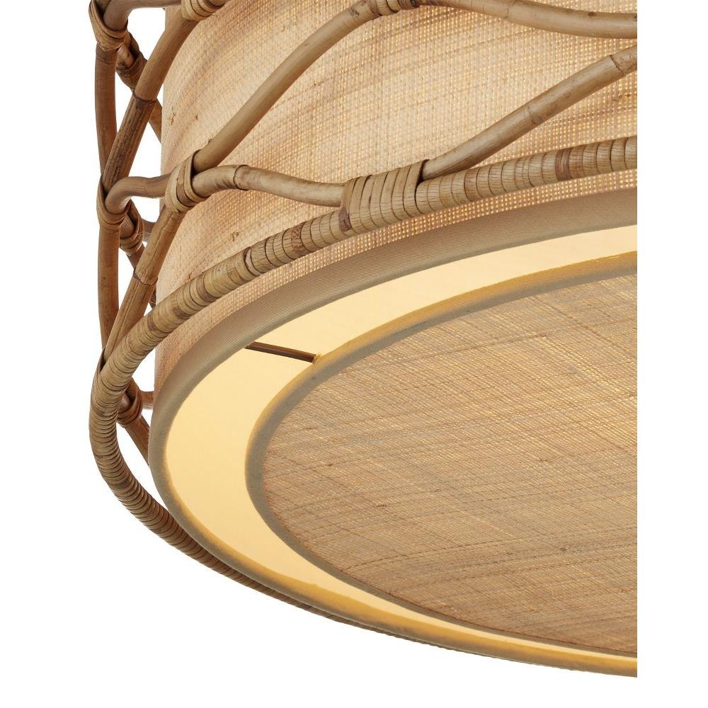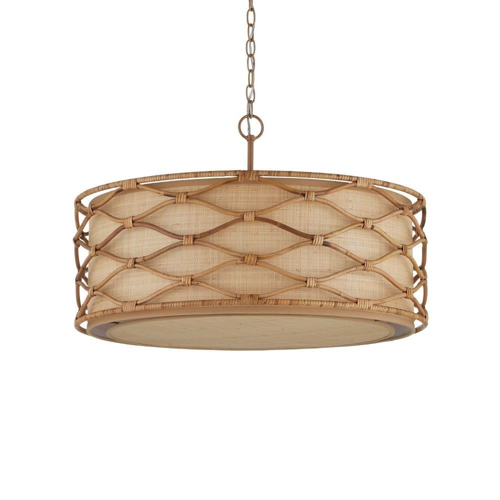 The Partita Pendant is a natural material story through and through. The illumination is softened from the sides and the bottom by grasscloth that shows off its subtle texture when the light filters through it. Surrounding the shade is a rattan pattern that flows elegantly without seeming to begin or end. The process to create this ornamentation is painstaking, as the rattan is steamed and bent by hand, then bound together with thin bands of the same material. To be consistent with the overall color of the other elements, the wrought iron frame and hardware on the pendant are finished in a saddle tan. Adjustable from 24.5" to 92.5" with use of included chain/rod kit/cable. If your space calls for a longer drop, additional chain/rods/cable is available for purchase.