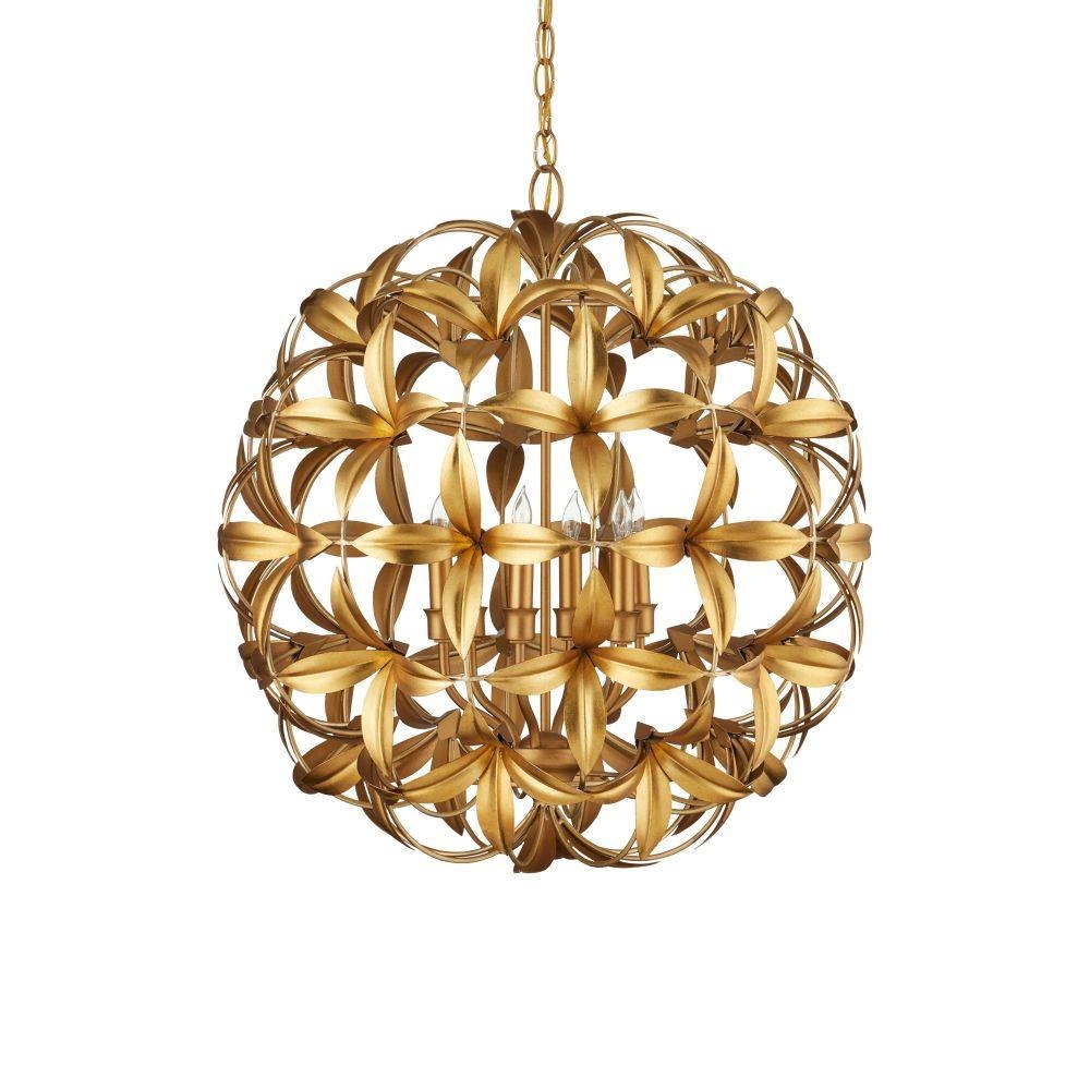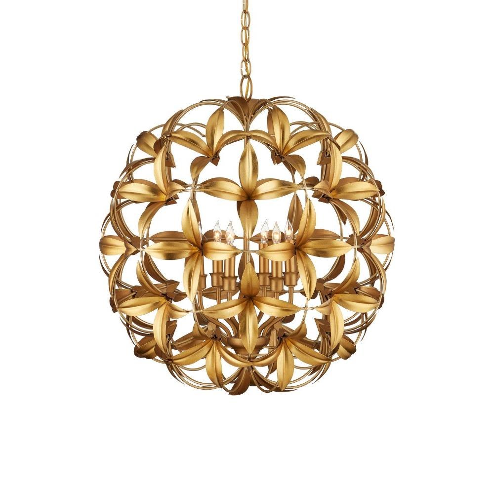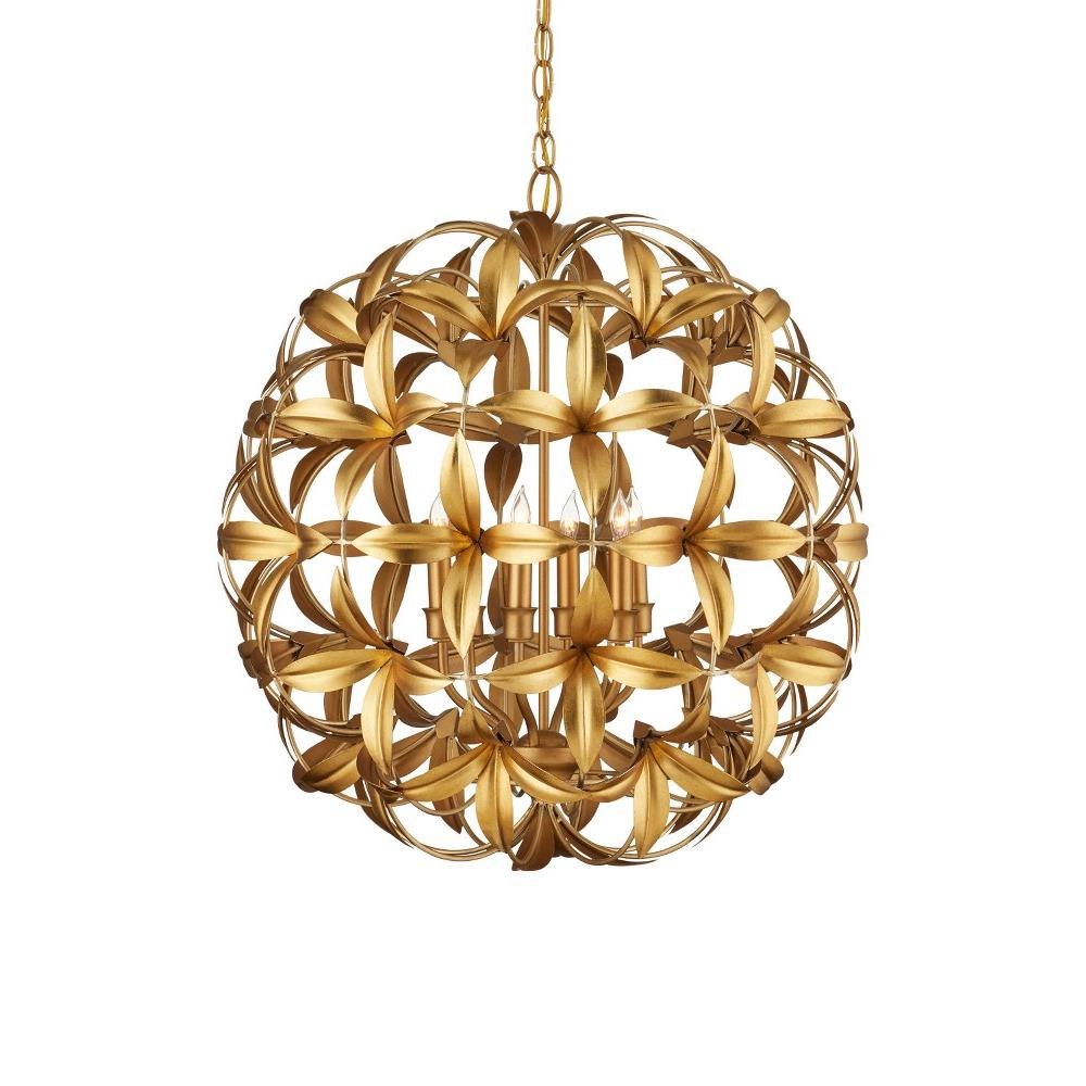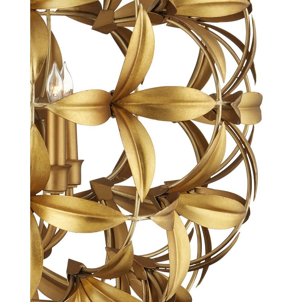 The Helenium Orb Chandelier is a whimsical nature-inspired piece made of wrought iron in a mix of contemporary gold leaf and contemporary gold finishes. Four flowers blossom from each tuft that is affixed to the frame in a steady flow of flourishes, the motifs making this gold chandelier a luxurious fixture and a big hit for flower lovers. Each of the blossoms are cut and stamped before being welded to the frame. Adjustable from 31.75" to 99.75" with use of included chain/rod kit/cable. If your space calls for a longer drop, additional chain/rods/cable is available for purchase.