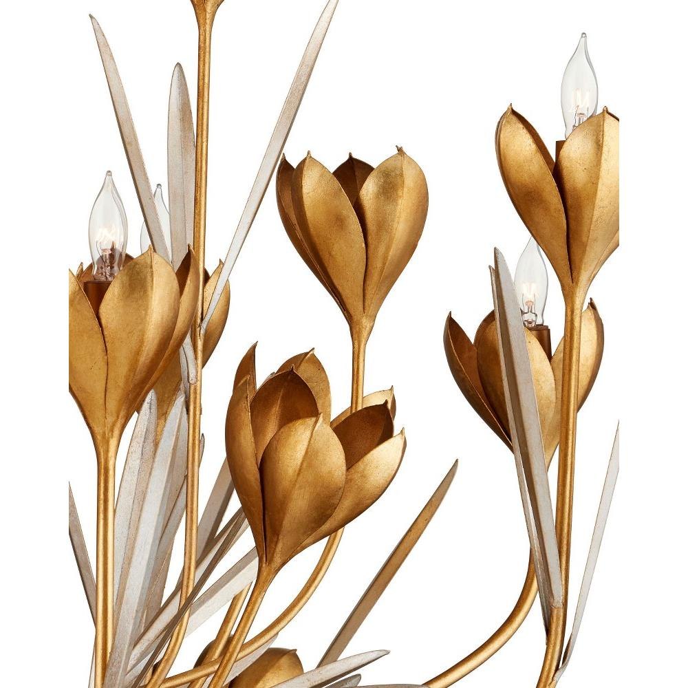 The flowing shape of the Hortensia Chandelier was inspired by the crocus flower, which is evident in how its blossoms open toward the ceiling as if they are growing toward the sun. The blooms and frame of the wrought iron chandelier are covered in a contemporary gold leaf finish while the linear leaves are in a contemporary silver leaf finish for a fanciful contrast. Adjustable from 33" to 101" with use of included chain/rod kit/cable. If your space calls for a longer drop, additional chain/rods/cable is available for purchase.