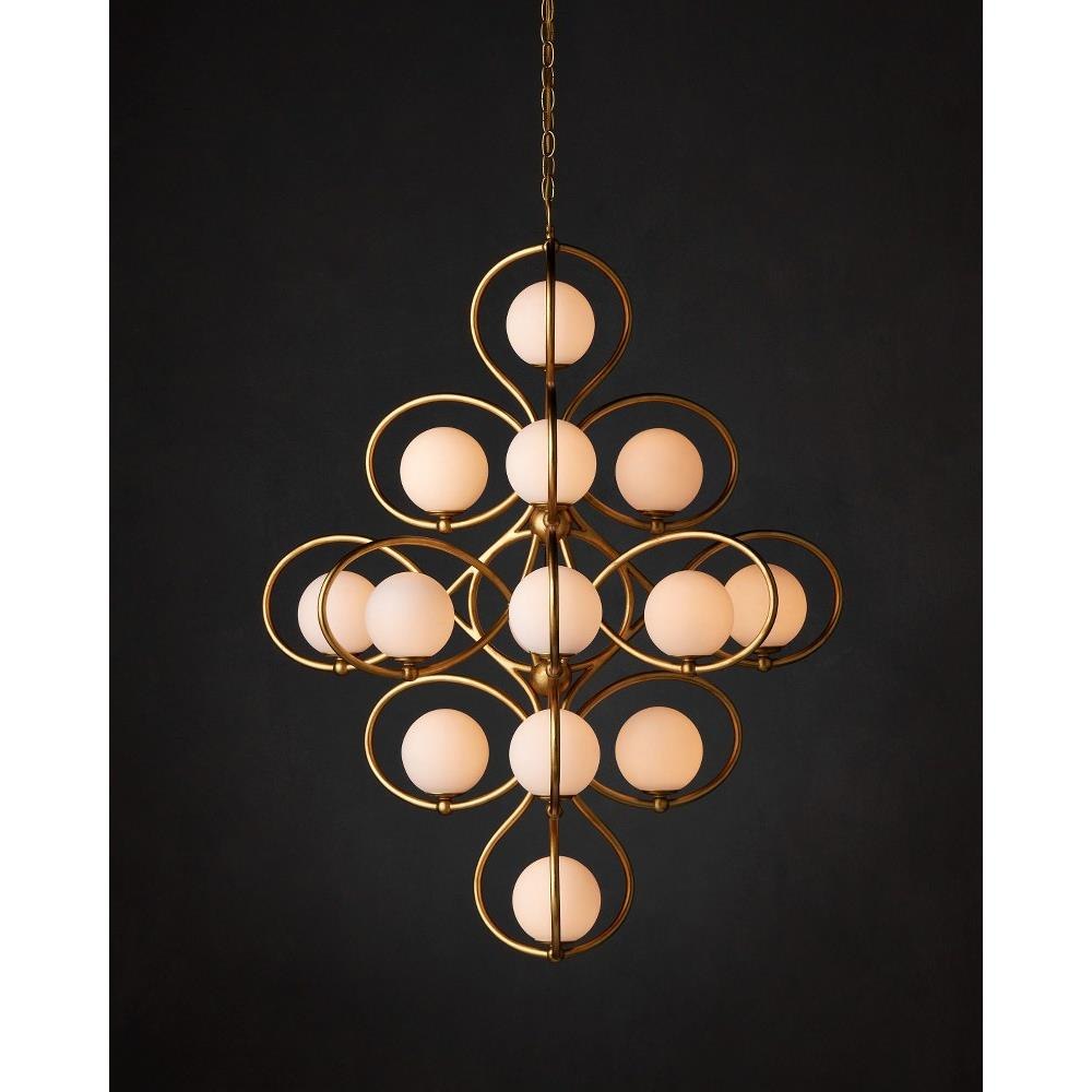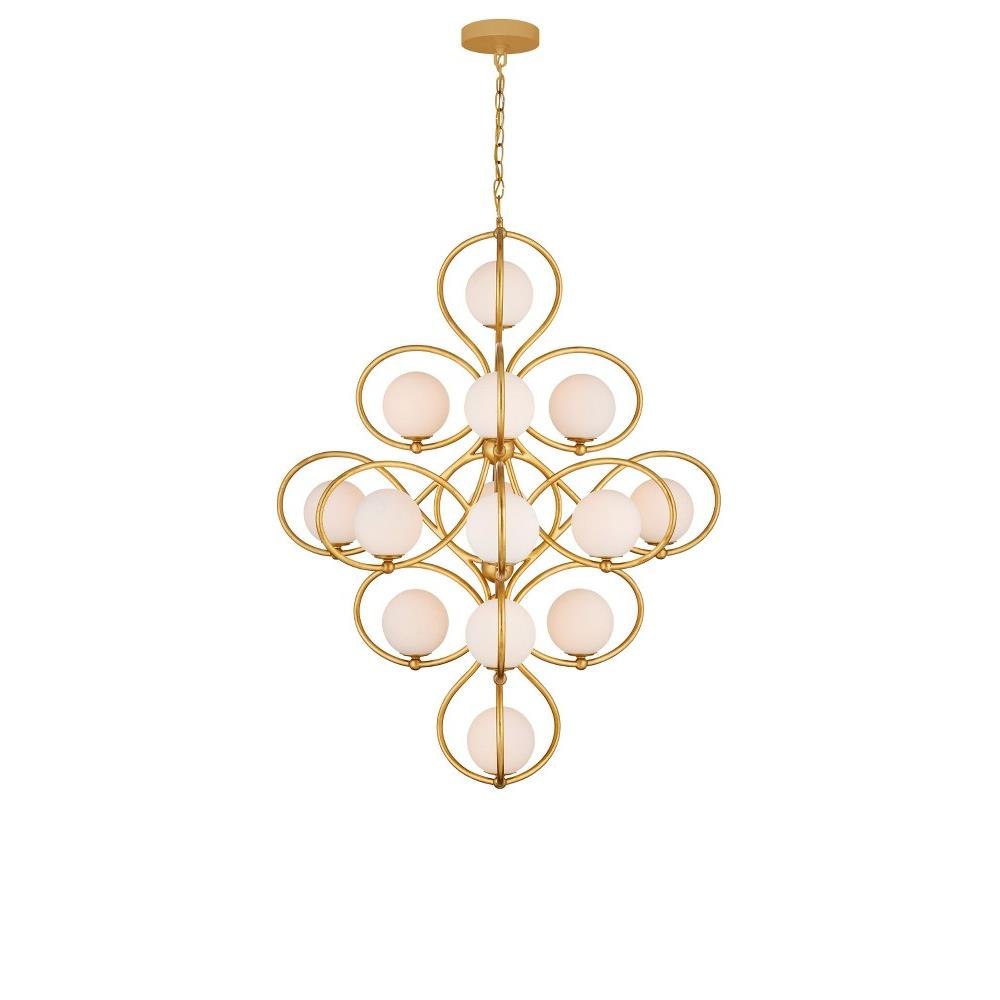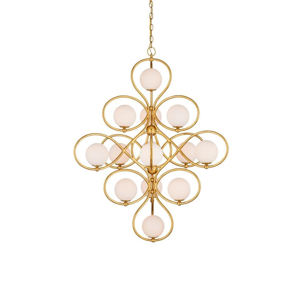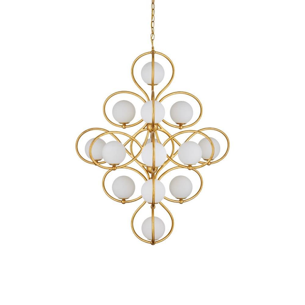 The Storrs Chandelier is a looping creation with 14 lights that will wow from a design perspective and for how much illumination it provides. Made of wrought iron in a contemporary gold leaf finish, the swirling frame is so perfectly curved, the milky glass globes perch atop the curlicues in a balanced and playful pattern. This artisanal gold chandelier with its '20s Milano feel has an interesting shape-shifting vibe when viewed from different perspectives. Adjustable from 50.5" to 118.5" with use of included chain/rod kit/cable. If your space calls for a longer drop, additional chain/rods/cable is available for purchase.