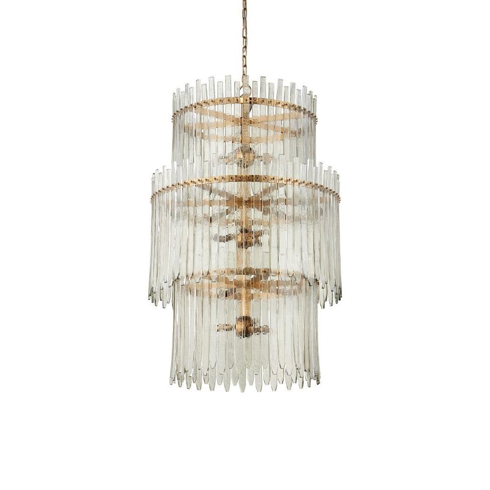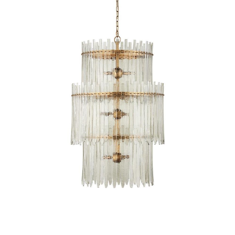 The Electra Three-Tier Chandelier is a luminous composition dripping with two sizes of glass bars that resemble icicles affixed to antique brass metal rings. The warmth of the gold contrasts the coolness of the glass to create interest, as do the handmade glass pieces themselves, which slightly curve in spots as they flow downward. Adjustable from 55.5" to 147" with use of included chain/rod kit/cable. If your space calls for a longer drop, additional chain/rods/cable is available for purchase.